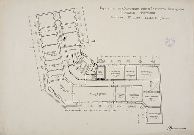 Tavola quotata a penna raffigurante la planimetria del secondo piano di un edificio per l'Istituto Nazionale d'Assicurazione per gli Infortuni sul Lavoro. Scritte identificano la destinazione d'uso dei locali o le loro caratteristiche. Scala 1:100.