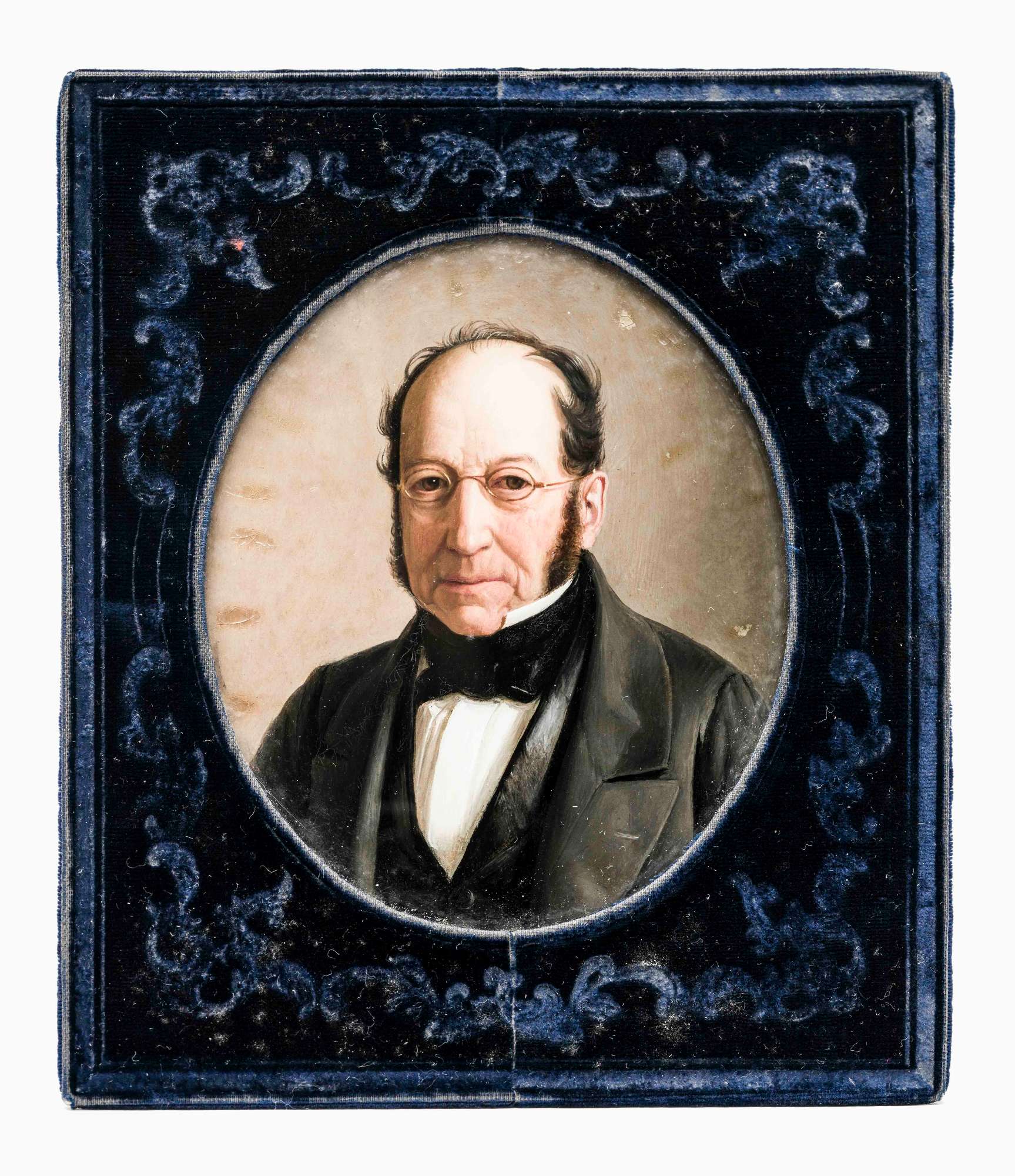 Miniatura ritratto ovale entro cornice in velluto blu; ritratto maschile.