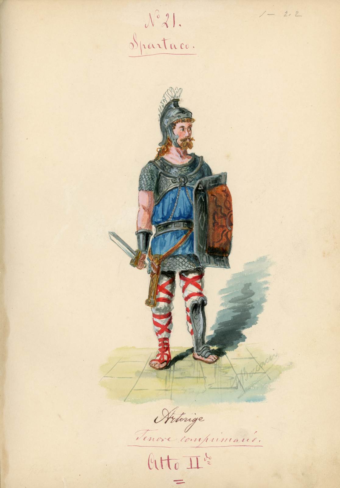 Spartaco, opera di Giuseppe Sinico. Figurino per il personaggio Artorige. Figura maschile intera in tunica corta turchese, corazza, elmo, scudo, gladio tenuto con la mano destra; gambe coperte da fasce in tela