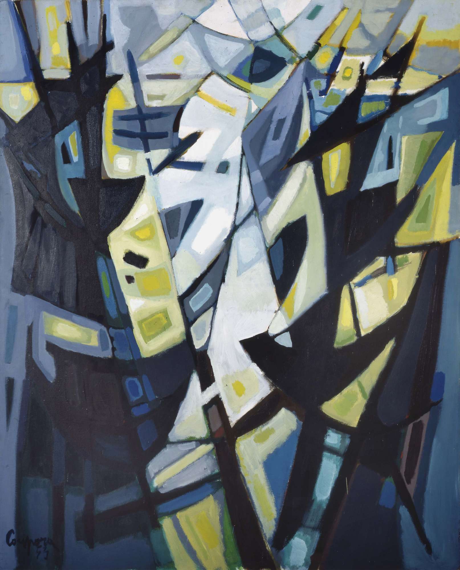 Nota anche con il titolo di "Composizione", l'opera viene esposta per la prima volta nella primavera del 1953 alla mostra "Arte astratta italiana e francese", organizzata dall'Art Club alla Galleria Nazionale d'Arte Moderna di Roma e presentata da Prampolini e Degand. Nell'autunno dello stesso anno compare alla nona edizione del “Premio Lissone” per la pittura, al Palazzo dell'Esposizione di Lissone (comune nei pressi di Monza), mentre tra agosto e settembre del 1954 viene presentata all'VIII Premio Nazionale di pittura “F.P. Michetti” a Francavilla al Mare, dove viene acquistata dalla Società Finmare (azionaria del Loyd Triestino) e donata alla città di Trieste, che, a sua volta, la destinerà al Civico Museo Revoltella in data 1 dicembre '54. Realizzata dopo l'adesione del pittore al sodalizio degli Otto pittori “astratto-concreti”, sostenuti da Lionello Venturi, rappresenta emblematicamente l'estetica del gruppo, sospesa tra il riconoscimento realista della funzione sociale dell'arte e la salvaguardia della spontaneità creativa dell'artista. Tra il 1952 e il 1953 Corpora raggiunge la piena maturità dei propri mezzi espressivi. Dopo aver sperimentato il fauvismo ed il cubismo durante un lungo soggiorno parigino ed essersi avvicinato, negli anni trenta, agli astratti italiani della Galleria del Milione, nel 1947 aderisce alla battaglia neorealista del Fronte Nuovo delle Arti, ma le implicazioni politiche del movimento lo inducono a cercare una maggior autonomia dell'espressione artistica, approdando, nei primi anni '50, ad una personale conciliazione tra linguaggio figurativo e astratto. L'impianto compositivo di "Due velieri", analogamente a quello di molti lavori dello stesso periodo, rimanda alle intersezioni di linee e di piani spaziali dell'estetica neo-cubista, a cui si era interessato sin dal 1946, quando aveva esposto alla Galleria del Secolo di Roma con Turcato, Monachesi, Fazzini e Guttuso. La raffigurazione del soggetto, due grandi imbarcazioni a vela, sembra non essere il principale obiettivo del pittore, che mira piuttosto a restituire sulla tela le emozioni provate di fronte al dato reale attraverso la forza evocativa del colore. Quest'ultimo affiora imbevuto di luce tra le maglie scure della griglia di segni in primo piano, come nei tasselli di vetro tra il piombo delle vetrate gotiche, restituendo la vitalità e la freschezza della sensazione visiva. Al pari di opere come "Composizione" (1952, Museo di San Paolo del Brasile) e "Mediterraneo" (1953, coll. Privata, Brescia), anche in questo dipinto l'autore suggerisce, attraverso le molteplici tonalità di blu, verde, giallo e bianco, la freddezza e la profondità delle acque marine, il movimento delle vele e i riverberi della luce solare, ottenendo il difficile equilibrio tra rigore formale e evocazione lirica, valore cardine della poetica “astratto-concreta”. Tra la fine del '53 e l'inizio del '54 la pittura di Corpora si fa più istintiva e “si costruisce per libera, balenante, eccitata foga d'incontri e scontri di luce e materia, solcati da un segnare che non più spartisce e ordina, ma solca all'interno, trepido, il corpo del colore” (F. D'Amico, Il rinnovamento della pittura in Italia.., 1996). Rappresentativa di questa nuova tendenza stilistica è l'altra opera di Corpora posseduta dal Revoltella: l'olio "Pescherecci", datato 1954 e acquistato dal museo in occasione della Biennale di Venezia dello stesso anno.