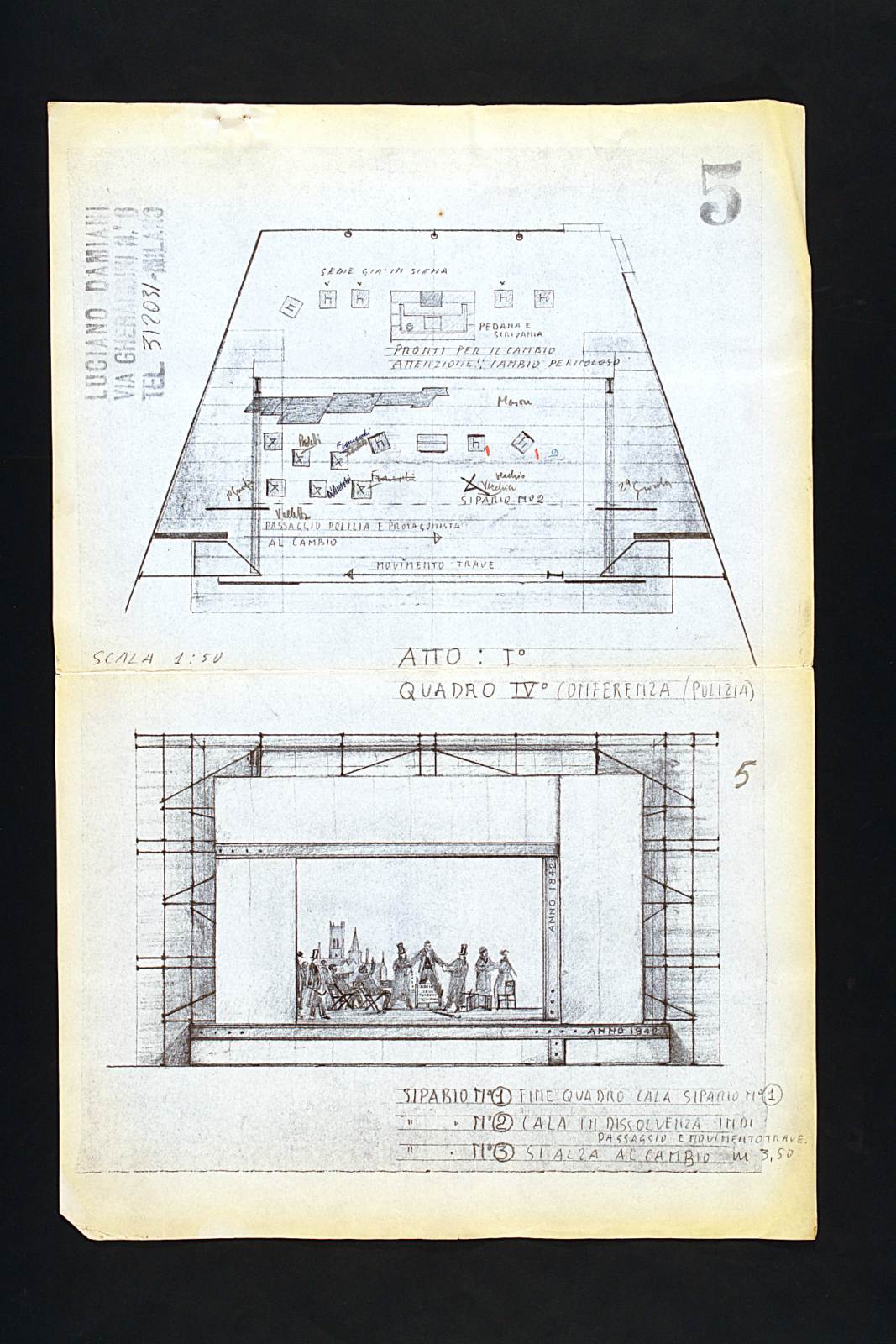Motivo di scandalo e di riflessione, due tempi di John Osborne. Spazio del foglio diviso orizzontalmente in 2 parti: in alto pianta del palcoscenico, in basso bozzetto scenografico con gruppo in una conferenza e arresto dell'oratore da parte di gendarmi. Sullo sfondo palazzi di città