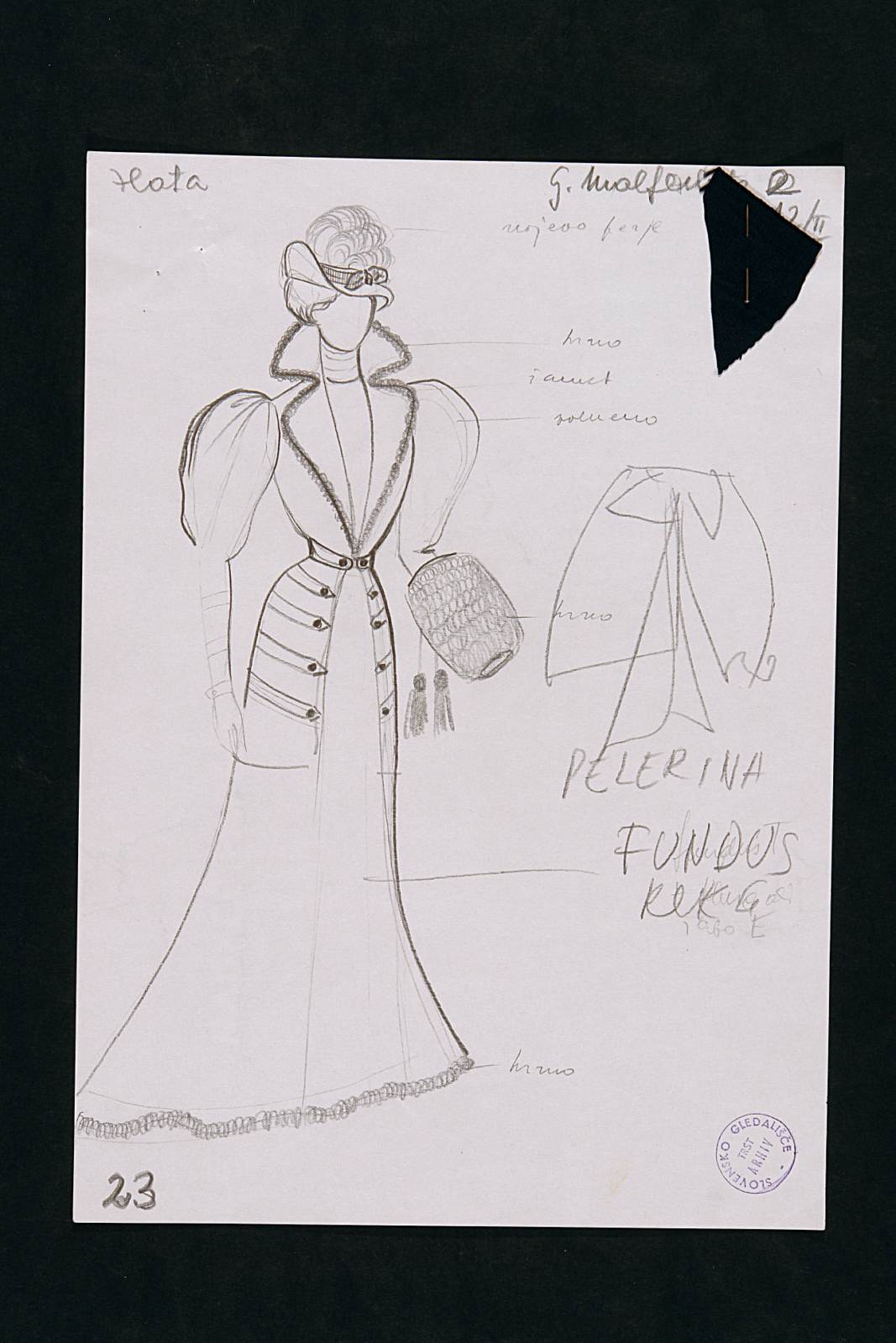 La coscienza di Zeno (Zenova Izpoved), di Italo Svevo nel rifacimento scenico di Tullio Kezich. Costume per G, Malfenti. Figura femminile intera, soprabito lungo, manicootto, cappellino con piume