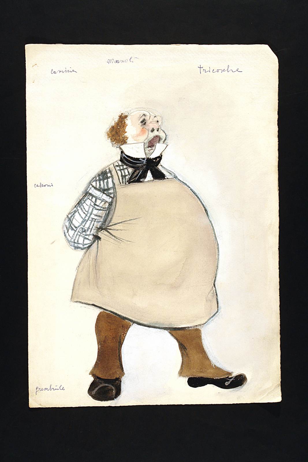 La cagnotte, testo teatrale di Eugène Labiche. Figurino per Tricoche. Figura maschile intera di 3/4,calzoni marrone chiaro, camicia a quadri, camicia alta a collo chiuso da foulard, ampio grembiule beige