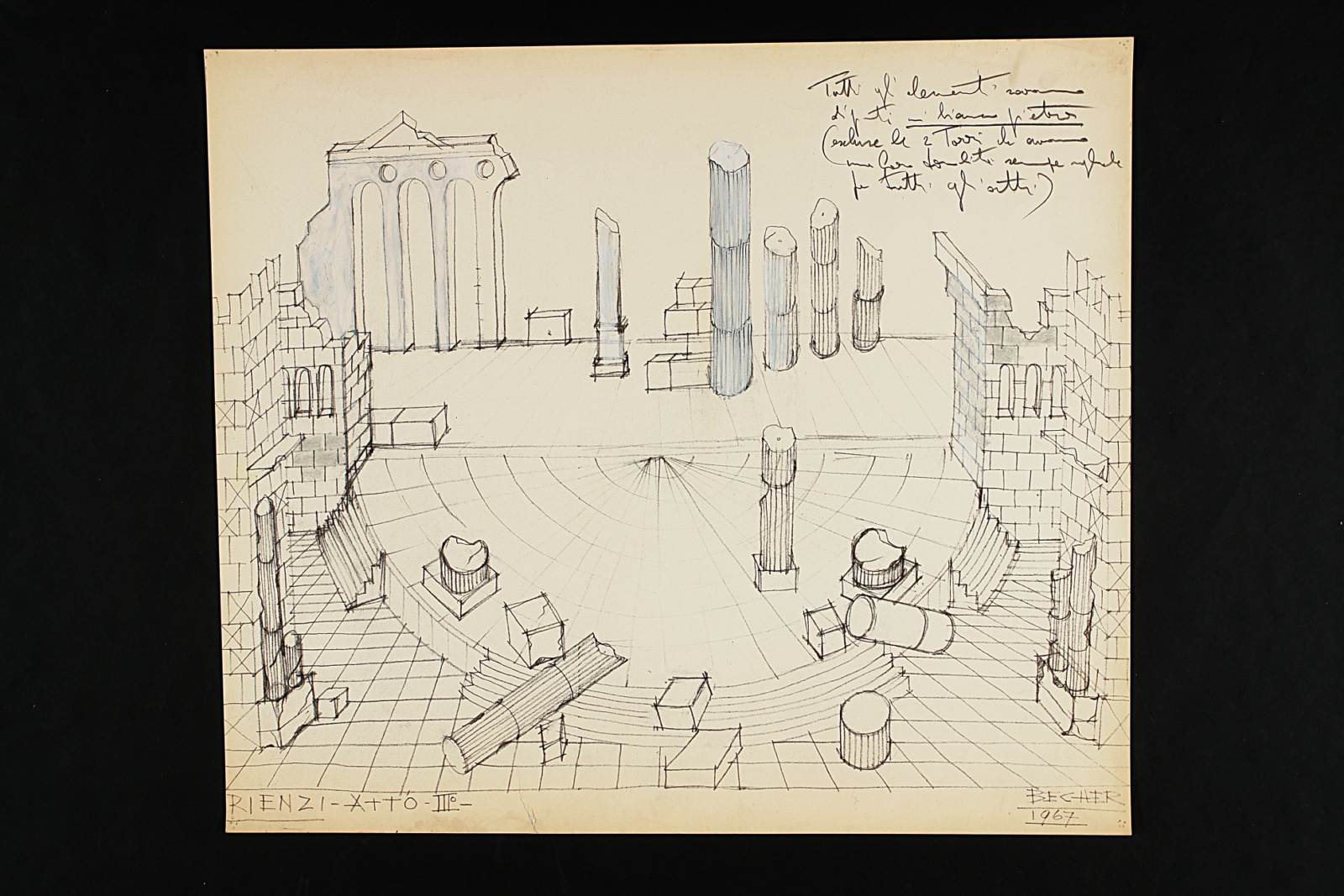 Scenografia per Rienzi, l'ultimo dei tribuni di Richard Wagner, Trieste, Teatro Verdi, stagione lirica 1967-1968, regia scene e costumi di Gianrico Becher