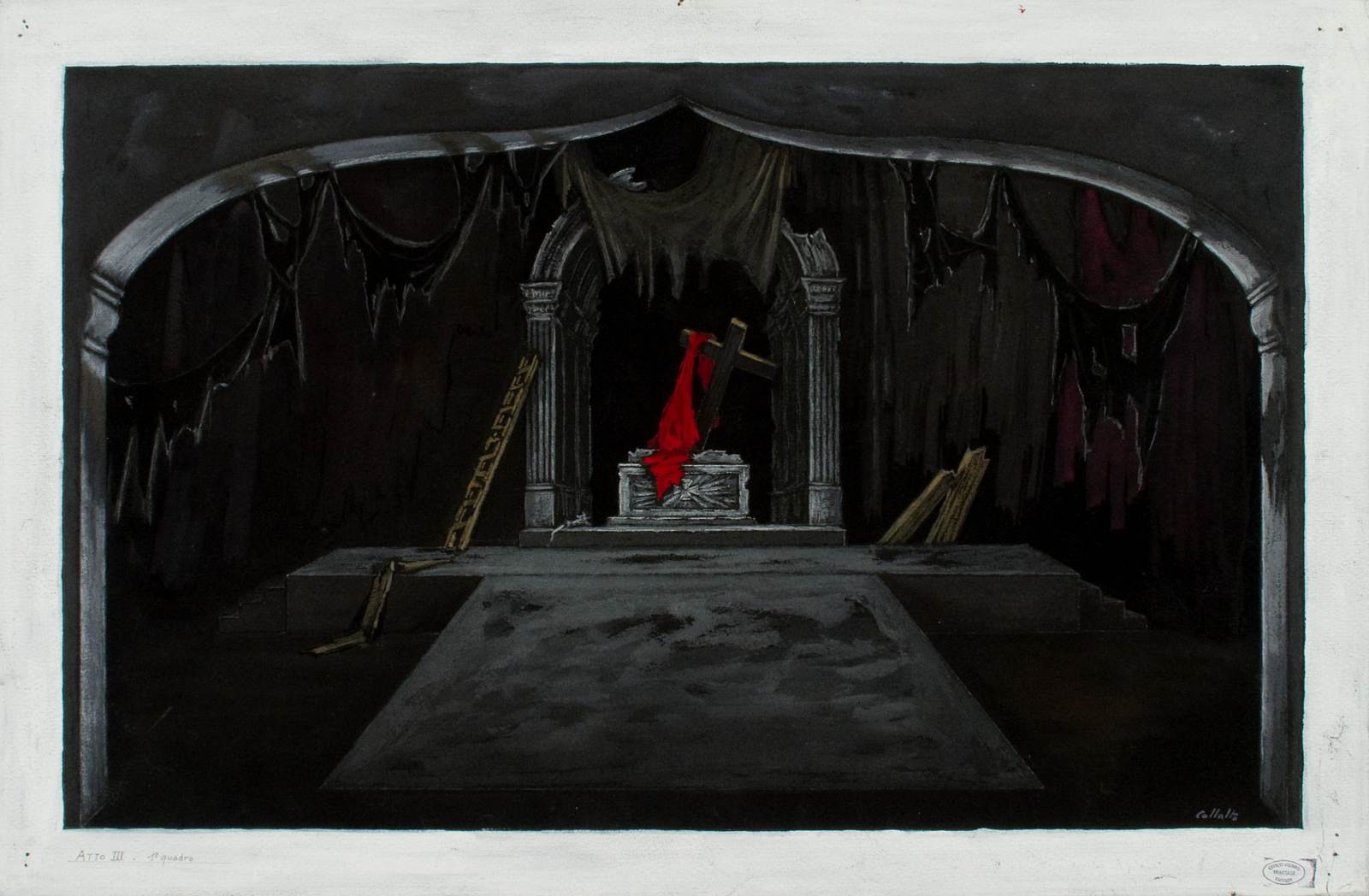 Bozzetto scenografico per I dialoghi delle carmelitane, opera di Francis Poulenc, prima rappresentazione 23 novembre 1957, Teatro Comunale Giuseppe Verdi Trieste, regia di Franco Enriquez