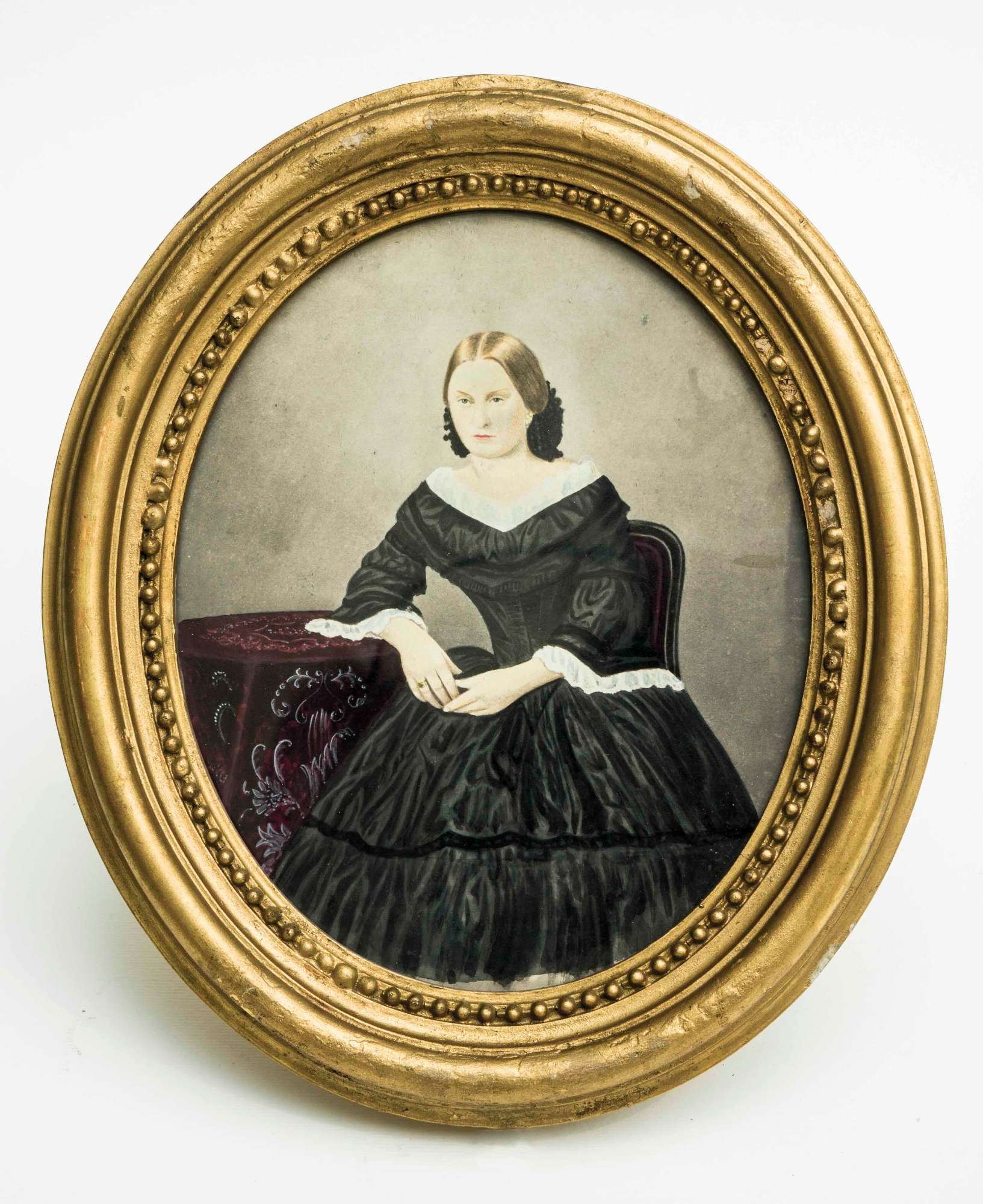 Entrata nelle collezioni civiche nel 1925 attraverso acquisto presso Giulio Tramontini, la miniatura ritratto raffigura Giuseppina Miniussi Casati, dando credito all’iscrizione vergata a tergo della cornice. Si tratta con tutta probabilità di un ritratto fotografico (ritocco da dagherrotipo), ritoccato a tempera. La figura, seduta in un interno, indossa un abito in raso nero dalla vita stretta, allungata da un corpetto che finisce a punta davanti; ampio scollo bordato di pizzo. I capelli, separati da una scriminatura centrale, sono tenuti piatti sulla sommità del capo e fissati sulla nuca con un fiocco.