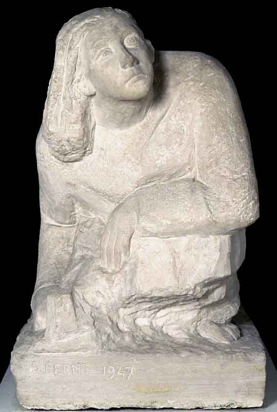 Dopo aver esposto questo Autoritratto nel 1947 alla sua prima mostra personale, allestita alla “Galleria Trieste” di Trieste, Sylva Bernt lo donò al Museo Revoltella. I critici dell’epoca avevano recensito l’opera con entusiasmo; Remigio Marini aveva scritto: «Quel blocco di tufo vicentino, da cui sembra essersi disviluppata potente e prepotente la figura di quella donna, ripiegata in un contenuto sforzo, ma che protende in alto la bella testa vibrante di passione e di pensiero come a vittoriosa sfida sulla materia ribelle... quel blocco di pietra superbamente animato e vivo può essere l’immagine di un’artefice e insieme di un’idea, il ritratto morale di una volontà e di un destino». All’epoca dell’esecuzione, Sylva Bernt, nata a Gorizia da un famiglia di antiche origini magiaro-scandinave, aveva trentasette anni e un importante percorso artistico alle spalle. Formatasi in un clima culturale tipicamente mitteleuropeo, nel quale erano nati i suoi interessi per la letteratura, la musica, la danza e il teatro, si era trasferita a Venezia con la sorella Alma (coreografa, amica di Tancredi, Music e Cadorin) e qui, nel 1940, si era diplomata con Arturo Martini all’Accademia di Belle Arti e due anni più tardi aveva esposto per la prima volta alla Biennale. Oltre a rispecchiare efficacemente il temperamento dell’artista per il rigore plastico e l’energica scansione delle masse, rivela l’attenzione della Bernt alle forme massicce e squadrate della plastica medievale e ricorda nell’impostazione le figure stilofore di Arnolfo di Cambio. In un autoritratto precedente, esposto alla Mostra Sindacale della Venezia Euganea del 1943, la stessa autrice aveva limitato l’auto-rappresentazione alla sola testa e conferito grande forza comunicativa all’espressione del volto, stilisticamente caratterizzato dall’influenza martiniana. Una decisiva evoluzione stilistica nell’arte della Bernt era avvenuta dopo il suo trasferimento a Parigi, dove era stata chiamata nel 1952 per decorare la cappella del transatlantico “Bretagna” ed era rimasta fino alla morte, nel 1995. Al contatto diretto con gli artisti parigini si può, infatti, far risalire il suo avvicinamento al Nouveau Réalisme caratterizzante la sua ultima produzione.
