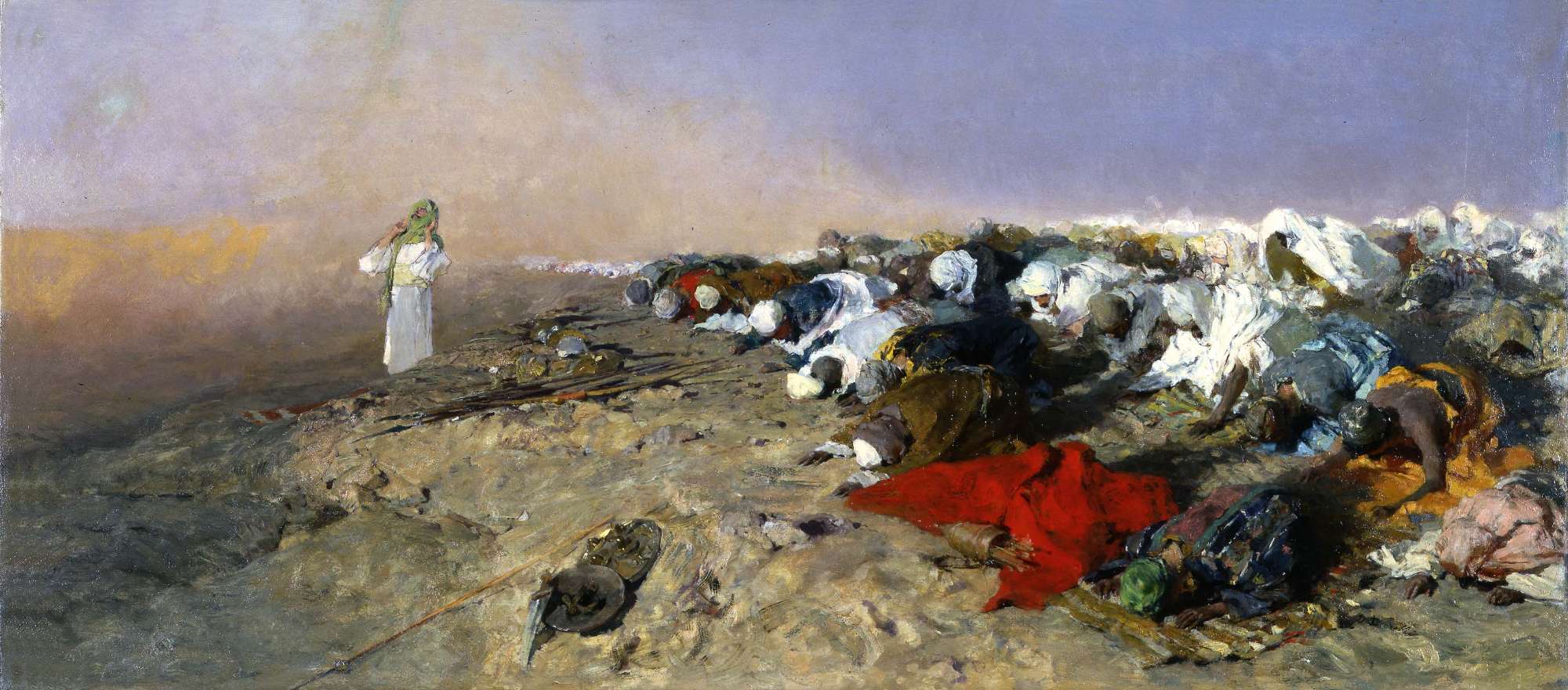 L'opera fu commissionata dal Museo Revoltella all'artista napoletano nel 1886. Nel gennaio del 1887 Morelli informava il Curatorio che un suo dipinto di soggetto storico, “non destinato ad altri”, stava per essere terminato: esso raffigurava Maometto in preghiera assieme al suo primo esercito, prima della battaglia. In una lettera di poco successiva il pittore specifica che la cornice, di fattura molto particolare, era stata fatta da lui in persona “appositamente adattata a quella pittura”. L'anno stesso d'esecuzione del dipinto in esame, il 1887, era l'anno della Esposizione Nazionale di Venezia a cui il Maometto di Morelli partecipò, ad esposizione inoltrata. La tela, come è riportato sulla Gazzetta di Venezia, fu collocata nella sala degli acquerelli e non mancò di suscitare l'ammirazione e il consenso dei più. “Qualunque sia la scuola che il visitatore predilige – commenta il giornalista – esso sente dinanzi a quel lavoro qualche cosa di straordinario, di potente, che lo trascina all'entusiasmo se il gusto suo collima con quello dell'artista, o che lo lascia pensoso ed ammirato se altro è il genere di pittura, cui, egli, il visitatore, meglio apprezza ed ama.” “Rappresentar figure e cose, non viste, ma immaginate e vere ad un tempo.” Era questo il principio ispiratore della pittura morelliana che, nel caso presente, “immagina” appunto un oriente mai realmente visitato se non attraverso lo studio delle carte geografiche e la lettura di testi specifici da cui l'artista potè trarre le descrizioni accurate dei viaggiatori che, fin dalla prima metà dell'800 si spinsero in terre lontane e ricche di fascino esotico. La preghiera di Maometto si inserisce nell'ultima fase della produzione morelliana, incentrata per lo più su tematiche bibliche e religiose (La Deposizione, 1872; Le Tentazioni di Sant'Antonio, 1878; Gesù nel deserto, 1895). «Il tema religioso, al quale si legano risvolti simbolisti – scrive Lodola a proposito di questo dipinto – diventa un pretesto per impiegare il proprio estro compositivo e cromatico.» (Lodola, in Gli orientalisti italiani…, 1998) Nelle opere realizzate in quegli anni lo stile dell'artista si configurava diversamente rispetto al linguaggio artistico accademico delle opere di epoca precedente. Il colore compatto dei dipinti dei primi anni, infatti, fu via via sostituito da un colorismo più sciolto, decisamente svincolato dallo schema disegnativo preesistente e molto vicino al rutilante colorismo della pittura di Mariano Fortuny, “abbozzata e sommaria”, in cui il soggetto si configurava come “notazione fugace” e in cui ogni aspetto (luce, ombra, tono e contorno) risultava “abbreviato e approssimativo”. Di questo dipinto esiste un'ulteriore versione realizzata nello stesso anno, appartenente a collezione privata (Siracusa), nella quale la figura di Maometto è posta alle spalle dei fedeli prostrati, anziché innanzi a loro.