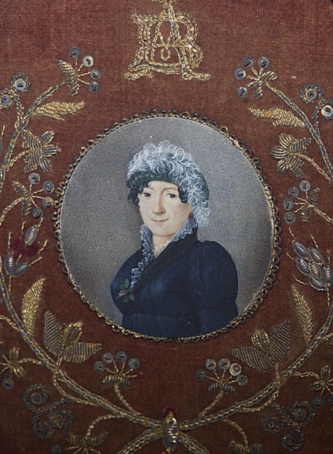 Cornice in legno dorato contenente un ritratto in miniatura di forma tonda raffigurante una giovane donna con cappello piumato, su supporto ricoperto di velluto con ricamati due serti vegetali e un monogramma.