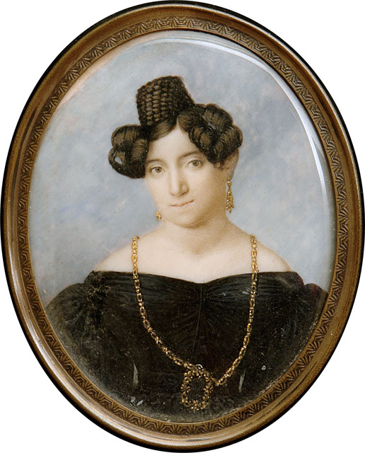 Ovale con ritratto femminile a mezzo busto. La donna raffigurata en face veste un abito di velluto scuro con ampia scollatura ovale, corpetto attillato, reso tale dall'utilizzo del busto, stretto all'altezza della vita da una cintura in tinta con l'abito e dotata di una fibbia dorata. Attorno al collo la donna porta una preziosa collana, mentre ai lobi vi sono degli orecchini; acconciatura a giraffa.