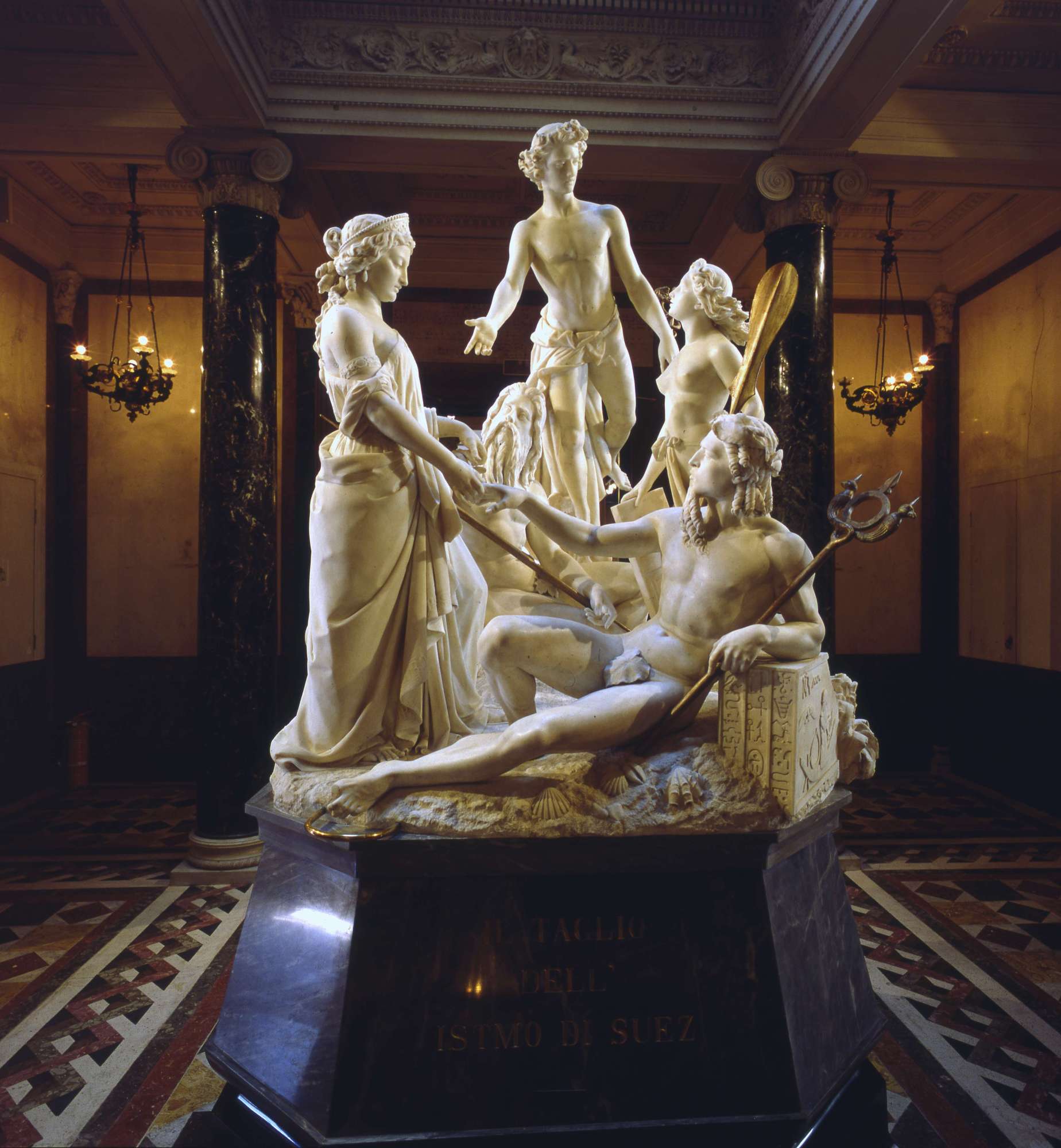 Quando il 23 febbraio 1859 Revoltella inaugurò la sua magnifica dimora con una festa sontuosa, alla presenza di illustri invitati, quali l’Arciduca Massimiliano d’Asburgo e Ferdinand de Lesseps, fu presentato il bozzetto in gesso del gruppo allegorico dedicato al "Taglio dell’Istmo di Suez", nello stesso anno in cui si avviavano i lavori in Egitto, sotto la direzione dello stesso Lesseps. Come l’articolata scultura della Ninfa Aurisina, anche questo imponente gruppo in marmo, che simbolicamente allude alla colossale impresa in terra africana, è collocato in una posizione di massima centralità e importanza all’interno di Palazzo Revoltella, nell’atrio del piano nobile, frutto di una oculata regia programmatica, non priva però di una certa attrattività. Revoltella, da molti anni impegnato nell’affaire de Suez, fu tra i primi azionisti e tra i più convinti sostenitori di questa grande impresa internazionale, nella sua città, nonché vicepresidente della Compagnia Universale del Canale di Suez. Recepito il messaggio, lo scultore milanese, tra i più capaci interpreti della mentalità positivista ottocentesca, ben adeguandosi alle esigenze della ricca committenza alto-borghese, tradusse le convinzioni del mecenate veneziano nell’equilibrato complesso di questo gruppo allegorico, formato dalla personificazione dell’Europa, che congiunge le mani dei due mari, caratterizzati con attributi e fogge diverse, e dalle due statue di Mercurio, svettante sul gruppo, e della Navigazione, giovane donna contrapposta all’Europa, di fattura impeccabile e armoniosa. La versione definitiva del gruppo, realizzata in marmo bianco e poggiante su un basamento in marmo «bardiglio e pietra di paragone», fu descritta sulle pagine dei giornali locali e, in seguito, inaugurata il 4 febbraio 1864, nell’ambito di una nuova importante occasione mondana. Nel 1864, alla bellezza raffinata del gruppo di Magni, portavoce di un promettente futuro, Revoltella affiancava, idealmente, un proprio contributo personale allo sviluppo economico generale, pubblicando il volume "La compartecipazione dell’Austria al commercio mondiale", volto a stimolare il governo austriaco a riconoscere l’importanza dei cambiamenti storici in atto e affinché si adoperasse «a tutta forza per dilatare il suo orizzonte politico-commerciale al fine di associarsi attivamente al commercio mondiale transoceanico».