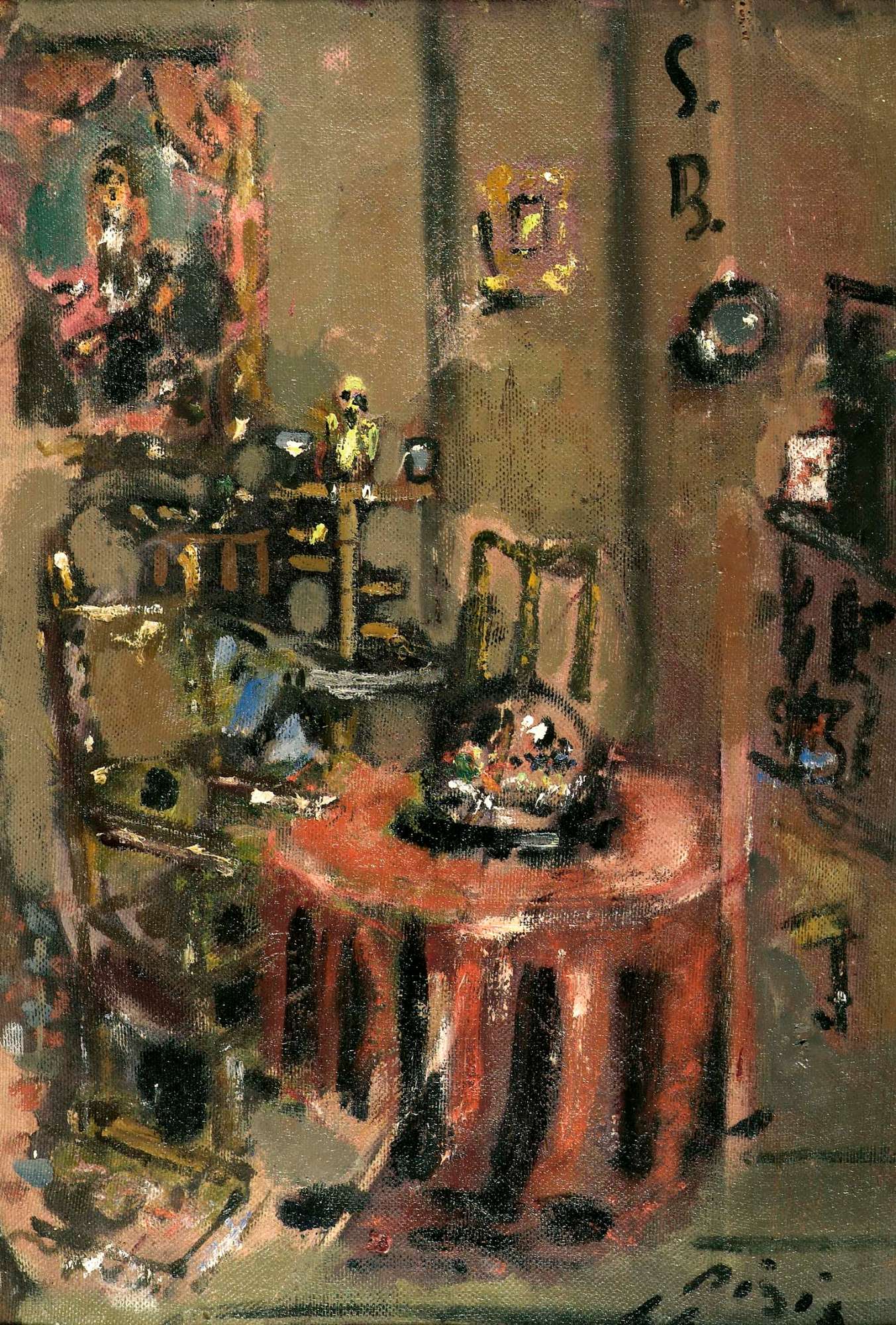 Firmato e datato in basso a destra “Pisis 44”, questo dipinto è entrato a far parte della collezione del Museo Revoltella grazie ad una cospicua donazione della Presidenza del Consiglio dei Ministri, Ufficio Zone di Confine, che - tramite una lettera del 17 settembre 1948 (n. 295/48) - aveva stanziato la somma di 2.000.000 di Lire per l'incremento delle collezioni ai Musei Civici di Trieste. Il fondo era stato equamente diviso tra il Museo del Teatro e il Museo Revoltella e per quest'ultimo erano state acquistate 23 opere, scelte dall'allora Soprintendente ai Monumenti Gallerie e Antichità di Trieste, Fausto Franco. Dopo un'annosa questione – documentata, nell'archivio del museo, da alcune lettere di sollecito - nel 1955 furono finalmente consegnati al Revoltella i dipinti, tra i quali figuravano, oltre quelli di diversi artisti triestini, anche i lavori di importanti maestri nazionali, come Morandi, Semeghini, Tosi e de Pisis. Acquistato nel settembre del 1950, "Interno con Cocò" (come documenta un talloncino posto a tergo dell'opera) era di proprietà della Galleria del Cavallino di Venezia, che nel giugno dello stesso anno aveva ospitato la mostra "Maestri della pittura contemporanea", a cui de Pisis aveva partecipato. Nella città lagunare de Pisis si era trasferito nel 1943, dopo che un bombardamento su Milano aveva distrutto la sua casa in via Rugabella. Nell'ambiente rappresentato - descritto con la più tipica fattura pittorica del maestro ferrarese, fatta di fulminei e approssimativi tocchi di colore - è forse possibile riconoscere la sala da pranzo di quello che egli amava definire il suo “palazzotto” veneziano, acquistato proprio nell'anno di esecuzione del dipinto e arredato con mobili di stile settecentesco. L'edificio si trovava in San Sebastiano 1709, detto alla veneziana “San Bastian”, da cui de Pisis aveva preso la sigla S.B., che nel dipinto in esame è posta in alto a destra. Considerando, però, che per qualche tempo dopo l'acquisto dell'abitazione questa era ancora occupata dai vecchi inquilini, è anche possibile che la suddetta sigla si riferisca a “San Barnaba”, dove il pittore teneva uno studio mentre era alloggiato al Hotel Serenissima. Le lettere S.B. compaiono nelle tele dipinte prima del 1949, anno in cui erano iniziati i suoi ricoveri in case di cura, dovuti a una malattia del sistema nervoso. Tornando all'analisi del dipinto, è possibile scorgere, dietro al mobile circolare coperto da una lunga tovaglia rossa, il trespolo sul quale è posato Cocò, l'affezionatissimo pappagallo che l'artista era solito portare sulla spalla durante le sue passeggiate per Venezia e per il quale, sempre nel 1944, aveva fatto decorare la cassetta da viaggio (oggi conservata alla Galleria d'Arte Moderna di Verona) dai suoi amici pittori: Tosi aveva dipinto il coperchio, de Chirico la facciata con il buco per l'areazione, Campigli il lato sinistro e lo stesso de Pisis il lato destro. L'opera del Revoltella riveste un interesse particolare se si considera che non sono molti, nella produzione dell'artista, gli interni in cui è visibile un'ampia porzione di stanza, mentre riproduce più spesso un frammento di realtà visto da vicino, riproponendo con straordinaria modernità il genere tradizionale della natura morta. Nella poetica di de Pisis l'interno, come ha scritto Stefano Crespi, “diventa “aspaziale”, “adimensionale”. C'è un aggregarsi degli oggetti, ma anche una tensione emotiva, imprevedibile, lievemente “analfabetica”. Ci sono citazioni, quadri nel quadro che evidenziano il tramonto del soggetto e quello struggimento, così contemporaneo, di un tempo slegato e anacronistico” (S. Crespi, Filippo de Pisis. Nature morte, Milano, Charta, 1996, p. 20). Dell'artista il Museo Revoltella possiede anche un olio su tavola del 1945, intitolato "Annaffiatoio" (Inv. n. 2901; n. 1945 4 del Catalogo generale, Briganti, 1991), donato dal Circolo di Cultura di Trieste nel 1946.