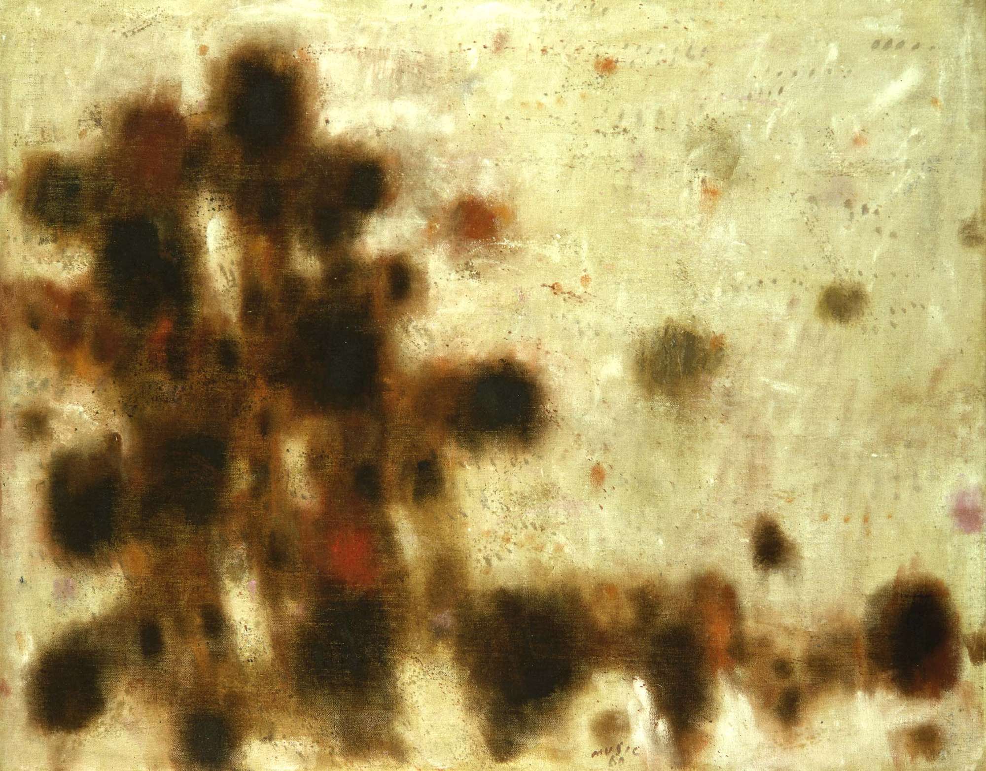 Questo dipinto di Anton Zoran Music è entrato a far parte della collezione museale nel settembre del 1968, assieme ad gruppo di opere di artisti contemporanei acquistate dal museo con il contributo di cinque milioni di lire stanziato dalla Regione Friuli – Venezia Giulia. In tale occasione le operazioni di acquisto, concluse direttamente con gli autori, sono state abilmente gestite dallo scultore Mascherini che, come si legge nel verbale della seduta del Curatorio del 2 settembre 1968, “avendo sottolineato con l'autorità e il prestigio della sua persona la funzione a cui il Revoltella sarà chiamato dopo il lavoro di ampliamento, è riuscito ad ottenere da artisti di primissimo piano sul campo internazionale – quali Mirko, Deluigi, Burri, Fontana, Music, Capogrossi – il dono di un'opera impegnativa in cambio del rimborso delle spese”. Music, che lo stesso anno, nella sezione intitolata “Linee della ricerca contemporanea: dall'informale alle nuove strutture” della XXXIV Biennale di Venezia, aveva esposto un'opera del 1959 intitolata "Suite bizantina", stilisticamente affine alla presente e appartenente alla “Galerie de France” di Parigi, aveva offerto l'olio in esame al prezzo di 800.000 Lire, all'epoca circa un quarto del suo valore di mercato. Il dipinto in esame, che reca sul retro della tela la scritta autografa di Music “Suite Byzantine 1960”, appartiene alla fase informale del percorso stilistico di Music. Dopo la famosa serie dei Cavallini e quella degli acquerelli delle Zattere e di San Marco - nelle quali il pretesto naturalistico era stato trasfigurato in una compagine di segni, inseriti entro calibrate tessiture cromatiche, memori tanto del colorismo veneto quanto delle dorature spente delle icone slave - alla fine degli anni cinquanta Music aveva avviato “il processo di rielaborazione del dato realistico, della sua trasformazione in segno, in macchia colorata, in tessuto formale rigorosamente controllato” (G. Marchiori, XXX Biennale Internazionale d'Arte di Venezia, cat. mostra, Venezia 1960, p. 105). L'esigenza di sviluppare completamente un tema lo aveva portato a creare molteplici varianti formali, come quelle presentate alla Biennale veneziana del '60, dove aveva presentato in una sala personale undici lavori raggruppati in tre serie: “Serie bizantina”, “Nel paesaggio il vuoto” e “Chiuso primitivo”. Come aveva sottolineato lo stesso Marchiori nella presentazione della mostra, la ‘serie' risultava necessaria all'artista per esaurire un motivo, per sperimentare le diverse possibilità espressive in relazione al variare delle dimensioni e della gamma cromatica. Dopo gli agghiaccianti disegni realizzati nel campo di concentramento di Dachau (che nei primi anni settanta saranno ripresi nel ciclo "Non siamo gli ultimi"), Music aveva attinto ai motivi e ai colori della natura, grazie ai quali era riuscito a riassaporare la libertà e a ricostruire la propria unità e autonomia spirituale. Dai paesaggi dalmati a quelli umbri, senesi, veneziani e orientali, l'elemento naturalistico veniva così trasposto in chiave lirica, evocativa e musicale. Documenta questa ricerca anche il dipinto in esame, dove le forme sono ridotte ai minimi termini, come segni magici affiorati dal repertorio indistinto della memoria, mentre la mobilezza rimanda ai rossi delle terre dalmate, ai bianchi calcinati dei muri, alle trasparenze dell'Adriatico. Nella versione francese del titolo (riportata a tergo dell'opera e dovuta al fatto che Music viveva a Parigi dal 1952), sembra implicita un'allusione alla musica - essendo la suite una composizione strumentale costituita da una serie di danze di unica tonalità o una serie di pezzi strumentali tratti da un'opera – grande fonte d'ispirazione per gli artisti dell'espressionismo astratto.