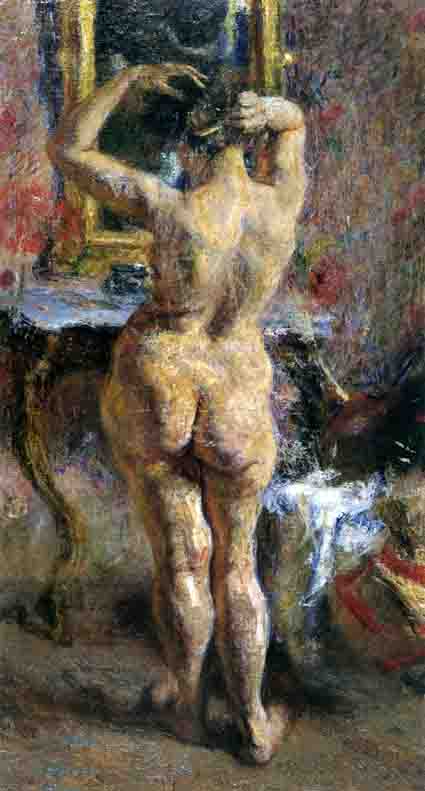 Questo monumentale nudo di donna allo specchio fu la grande rivelazione della retrospettiva ordinata a Trieste a neanche due mesi dalla morte di Veruda. In un articolo non firmato su "Il Piccolo", Silvio Benco, che fu uno degli organizzatori più convinti della mostra, parla entusiasticamente del quadro scoperto dopo la morte dell'artista: "Ecco quel formidabile studio dinudo (46), nel quale il Veruda è veramente un impressionista moderno nel più lato senso della parola, avendo ormai stabilito le relazioni reciproche di tutti i colori d'una mobilezza audacissima, in modo che ogni tratto abbia valore di luce e non esista più l'ingombro greve e opaco di materia morta che anticamente si chiamava l'ombra". Anche il recensore de "Il Lavoratore" ( che valorizza in particolare i pezzi già allora presenti o in seguito entrati nella raccolta di Italo Svevo) lo cita tra i lavori migliori della mostra ("v'è la cruda realtà: il grande nudo di donna visto di schiena!") e cerca di indirizzare gli acquisti del Museo Revoltella verso quel Nudo, "perchè difficilmente vendibile a privati, più adatto al detto museo". Il Curatorio del Revoltella, proprio in quei giorni impegnato nell'acquisto di Fondamenta a Burano, preferì assicurarsi il ritratto fatto a Veruda da Liebermann. Il Nudo rimase nella collezione dell'ingegner Veruda per passare quindi, con lo studio di nudo per Susanna e un altro nudo femminile, nella raccolta di Italo Svevo, affezionato cultore della memoria dell'amico. Nel 1932, quando venne inaugurato nel Giardino Pubblico di Trieste il busto di Veruda eseguito da Giovanni Mayer a pochi passi da quello di Svevo, la vedova dello scrittore donò al Museo Revoltella il Nudo di schiena, quasi soddisfacendo un desiderio espresso dalla critica alla morte dell'artista, e il nudo intitolato Abbandono. per la sua modernità di fattura il Nudo di schiena ha continuato a figurare negli allestimenti della galleria e in varie mostre. Ma la fortuna dell'opera risale alla sua scoperta: le parole che Benco le dedicò nel 1907, in un momento in cui il crito era particolarmente attento al fenomeno impressionista ("l'ispirazione di lui forse più mirabile, il grande studio di donna ignuda, cui su le carni ebro della molteplicità di colore che la sua luce contiene, questo studio vigoroso di linea e rigoglioso per la sfolgorante pienezza degli accordi cromatici"), sottolineano lo sperimentalismo tecnico del quadro e l'evoluzione dell'estrema ricerca di Veruda in senso post-impressionista. L'opera, non firmata nè datata, una sorta di esercizio privato dell'artista, dovrebbe risalire agli ultimi anni di attività di Veruda ed essere legata ai numerosi studi di nudo eseguiti in una delle tante libere accademie di Parigi.
