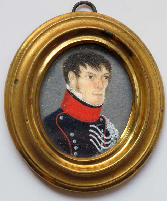 La miniatura, pervenuta nelle collezioni civiche nel 1900 attraverso il legato Carlo Zanella, ritrae un ufficiale dell’esercito, che indossa una giacca blu scuro, con pettiglia bordata di rosso, come il colletto rigido, e bottoni argento come i cordoni.