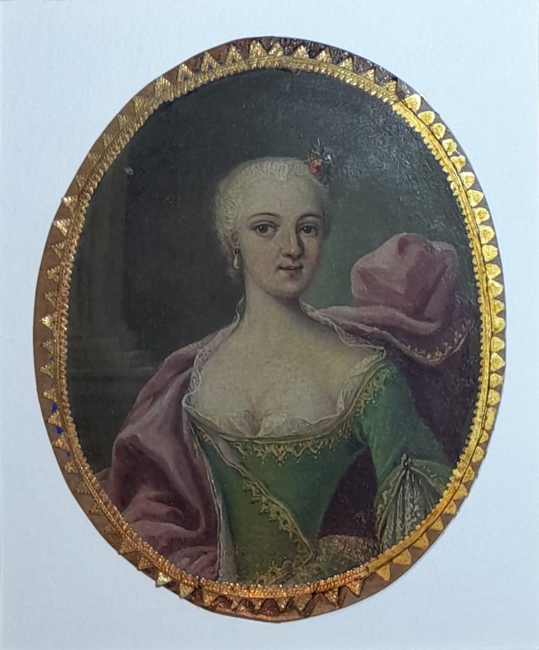 Ritratto in miniatura di un’esponente della famiglia de Leo, che è stata riconosciuta da Michela Messina in Regina Melchiora de Leo in Zanchi (1742-1821). La robe à la française e i fiori appuntati tra i capelli indirizzano a una datazione dell’opera verso il terzo quarto del XVIII secolo.