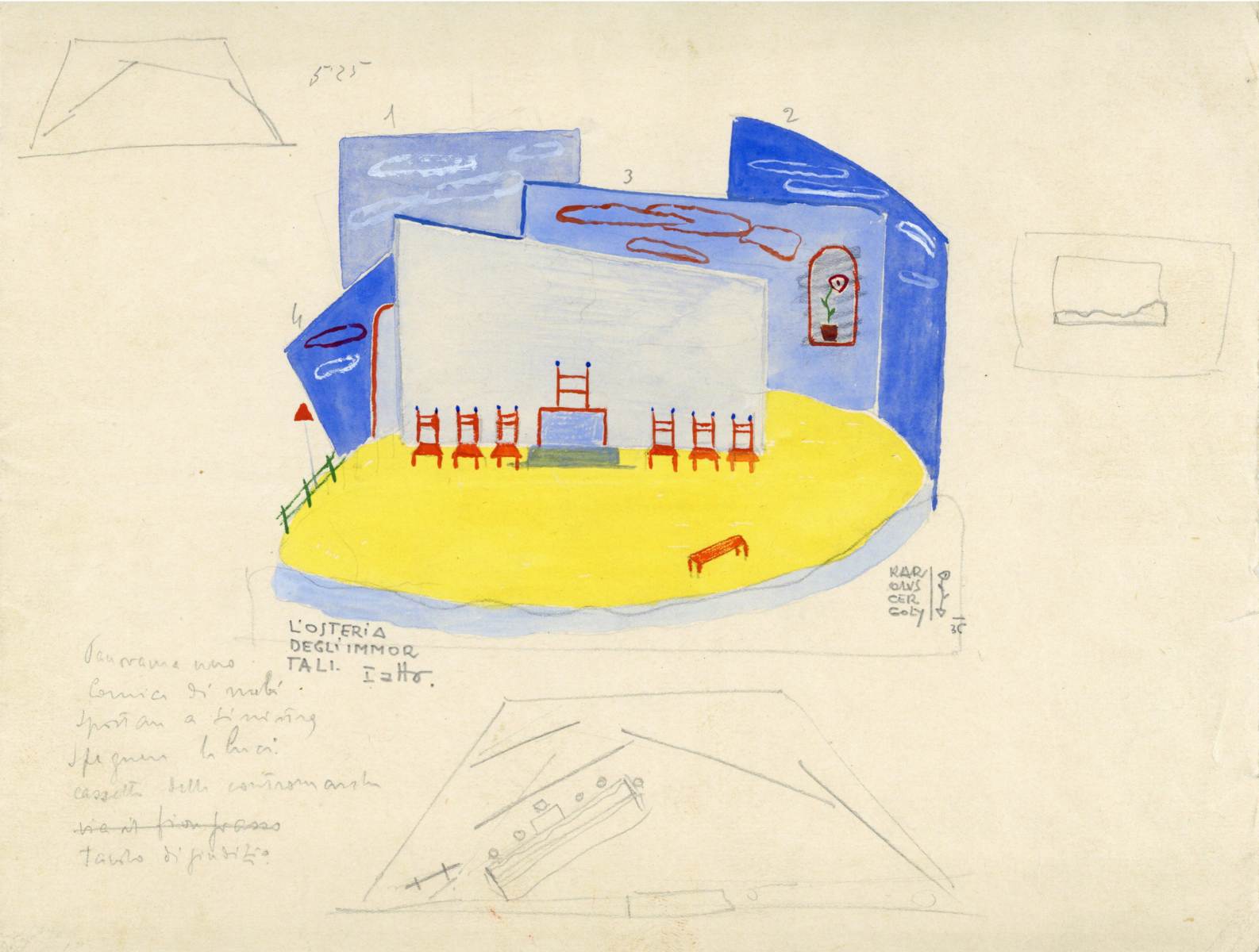 L'osteria degli immortali, testo teatrale di Mario Massa, bozzetto per scenografia, 1. atto, interno con sedie