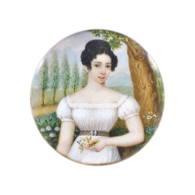 Dipinto in miniatura su avorio di formato tondo; ritratto femminile, tre quarti di figura, paesaggio.