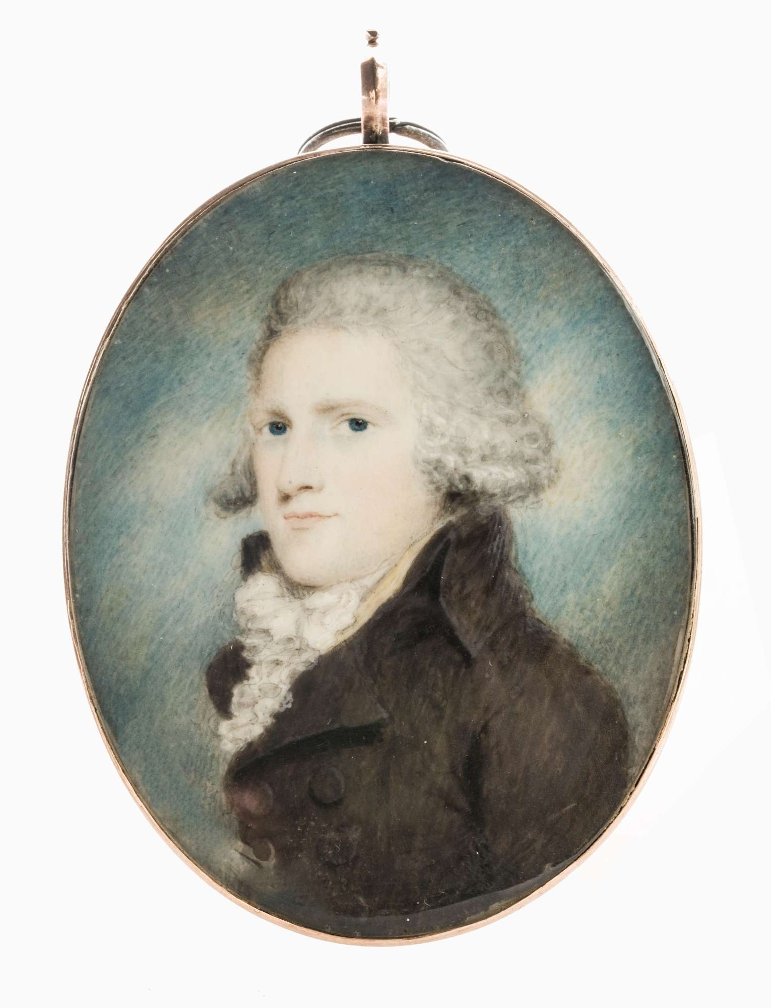 Il ritratto in miniatura, già in collezione di Jacques Mühsan, è stato legato ai civici musei triestini da Antonino Rusconi e Odinea Opuich nel 1976. Esso è riferibile all’ambito inglese della fine del XVIII secolo. Contro un cielo screziato di nubi si staglia l’effigie di un uomo che, raffigurato con una parrucca alies de pigeon, indossa una marsina marrone a doppio petto, una sottomarsina gialla e una cravatta di pizzo al collo. A tergo del ritratto su avorio, entro il medaglione, vi è una ciocca di capelli.