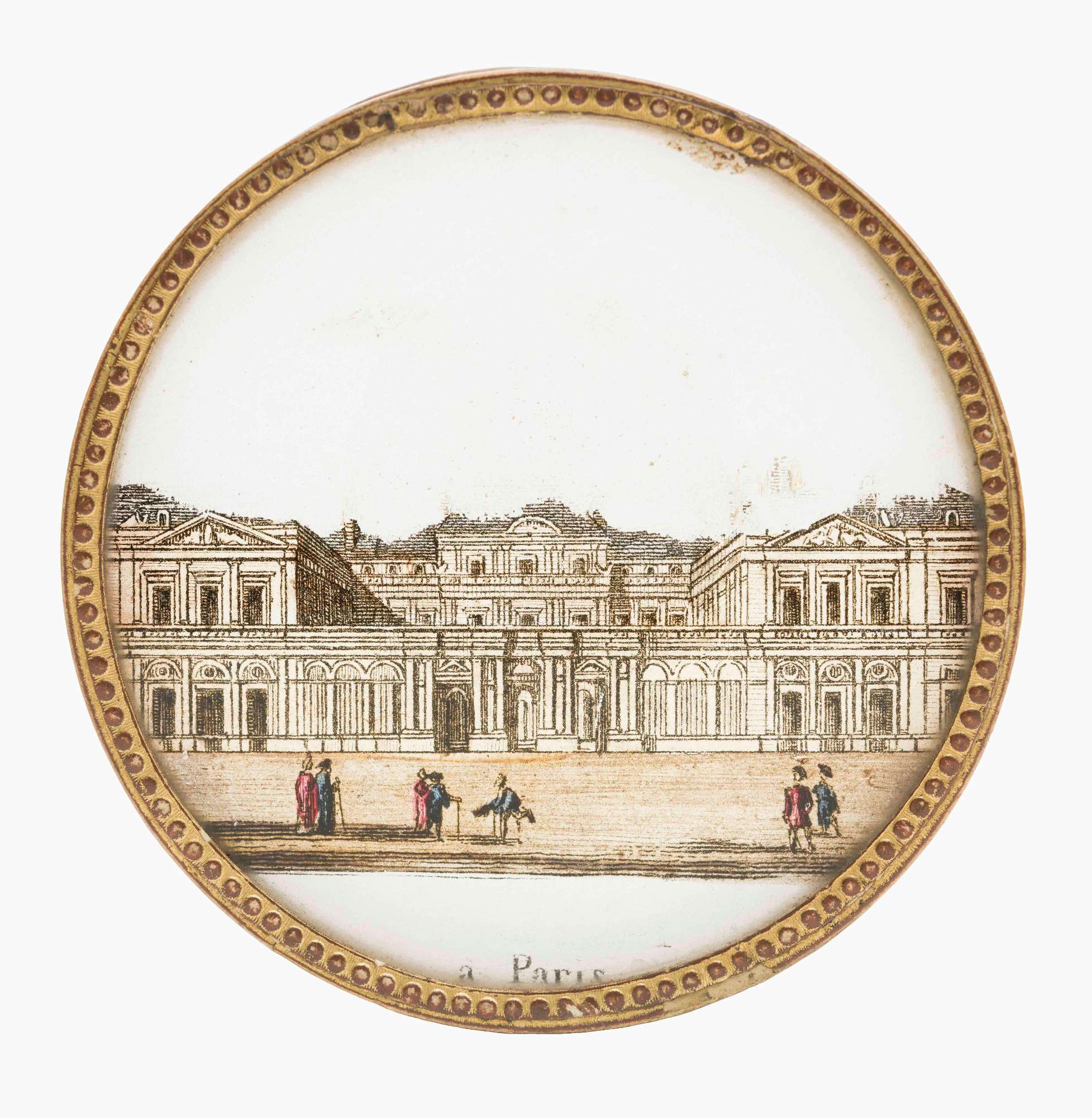 Scatolina circolare in vetro con veduta di palazzo parigino sul coperchio.