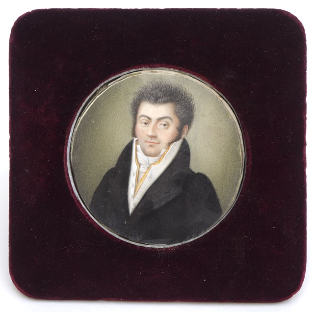 Miniatura di formato tondo che ritrae a mezzo busto un uomo, rivolto di tre quarti verso sinistra. L’abbigliamento e l’acconciatura suggeriscono una datazione verso gli anni trenta del XIX secolo.