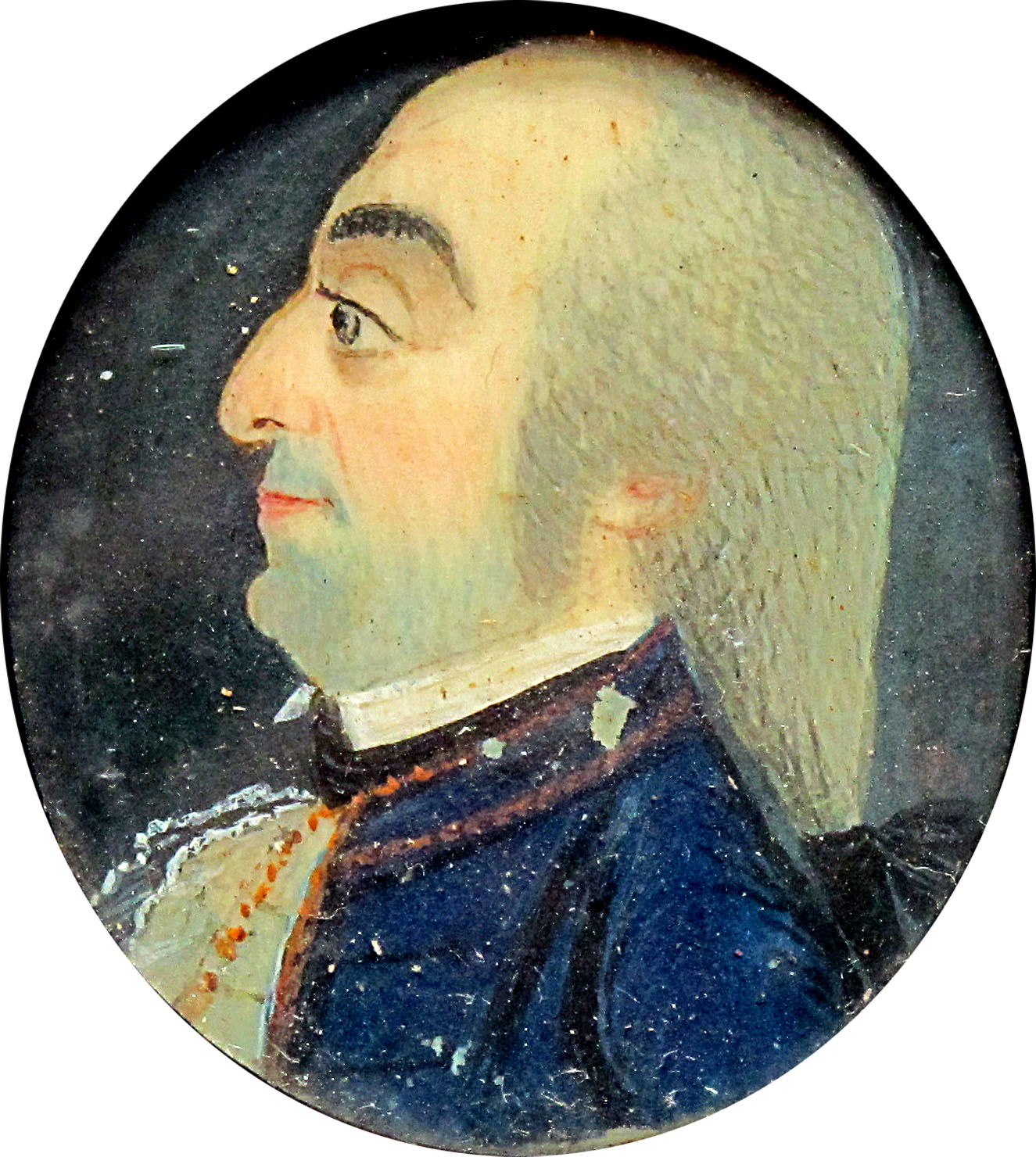 Nella miniatura, su sfondo scuro, è campito il ritratto al busto di profilo di un uomo, vestito di marsina scura che si contrappone alla camicia chiara. Il capo è coperto da una parrucca con capelli posteriormente stretti da un nastro nero. Un’iscrizione vergata a tergo della cornice riporta “Antonio de Ferretti morto li 24 ottobre 1801”. Non è stato possibile precisare il profilo biografico dell’effigiato, forse appartenente a una famiglia Ferretti di origine ferrarese, né precisare l’ambito di esecuzione della miniatura, che, racchiusa in una cornicetta lignea, mostra alcuni guasti alla pellicola pittorica.