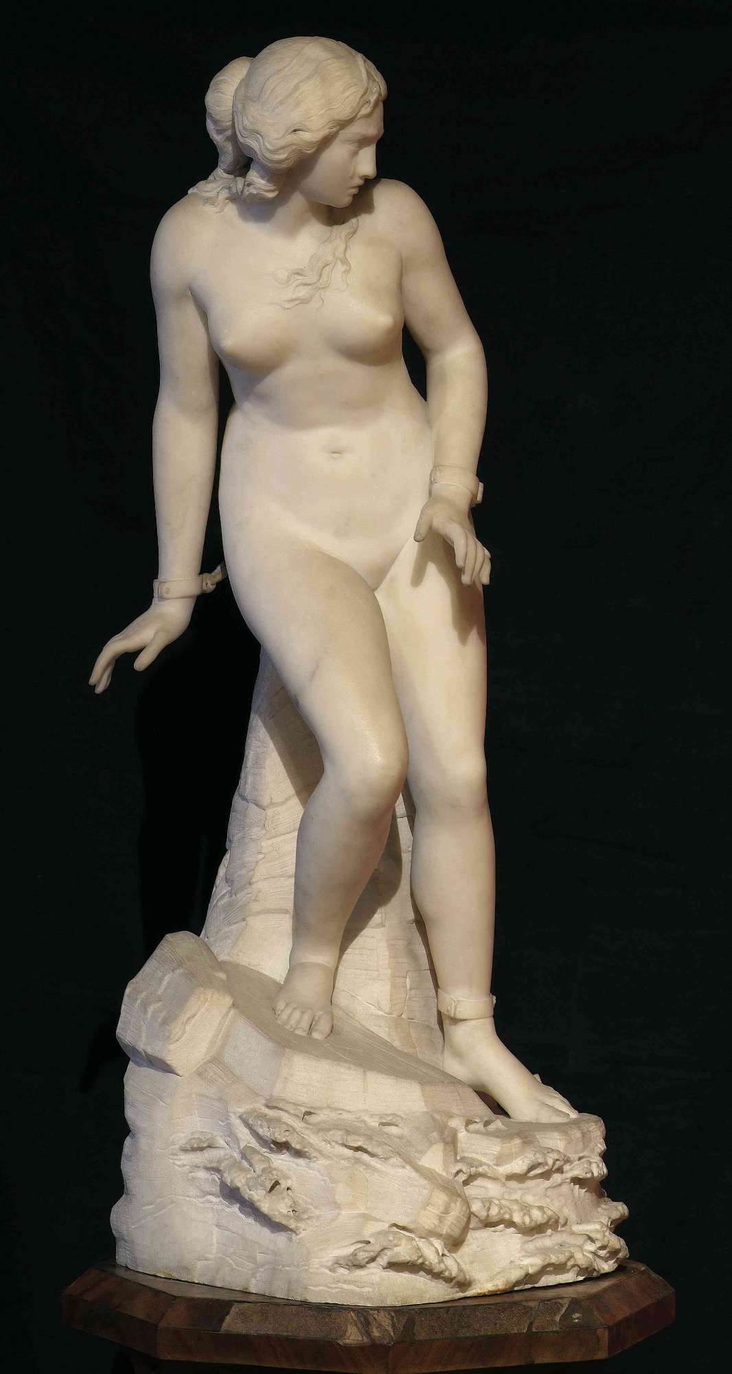 L’elaborazione del soggetto di "Angelica allo scoglio", probabilmente «grande al vero», risale al 1852, negli anni in cui – come riporta Tamburini – prima del viaggio a Firenze (1855) lo scultore milanese produsse anche altre opere di notevole successo commerciale, quali la "Mascherina", la "Danzatrice", il "Napoleone I che solleva la Francia abbattuta" ed altre ancora. Tamburini ipotizza che, delle numerose repliche, la copia appartenente al Museo Revoltella sia la copia in marmo esposta a Brera nel 1859. Definita dalla critica del tempo in maniera del tutto antitetica, come «un grande lavoro» condotto con «finitezza di tocco» o, diversamente, quale un’opera che lascia «freddi, insensibili e indifferenti», l’opera immortala un passo cruciale e drammatico del poema ariostesco, l’episodio dell’orca di Ebuda (Orlando Furioso, XI, 21-43), in cui Orlando si mette in viaggio verso l’isola di Ebuda, temendo che Angelica venga divorata dalla temibile orca che minacciava quei mari: «Fattosi appresso al nudo scoglio, quanto/ potria gagliarda man gittare un sasso,/ gli pare udire e non udire un pianto;/ sì all’orecchie gli vien debole e lasso./ Tutto si volta sul sinistro canto;/ e posto gli occhi appresso all’onde al basso,/ vede una donna, nuda come nacque,/ legata a un tronco; e i piè le bagnan l’acque». Di soggetto decisamente alternativo rispetto alle tematiche trattate dai due gruppi allegorici, celebrativi di due eventi storici contemporanei a Revoltella, l’attivazione dell’acquedotto di Aurisina e il Taglio dell’Istmo di Suez, l’Angelica sembra pertanto assimilabile ad altre sculture di Magni e di altri autori, commissionate per la decorazione interna del palazzo (le allegorie delle discipline teatrali nel Gabinetto ottagonale a specchi, le "Quattro Stagioni" degli allievi dell’Accademia di Carrara, i quattro busti di filosofi di Luigi Ferrari), la cui preminente funzione di exempla rispondeva pienamente al particolare concetto di museo immaginato da Revoltella, fin da quando era in vita, come un «istituto di belle arti», modello «accademico» per la formazione degli artisti, che «potevano studiare le opere dal vero ed esercitarsi nella copia».