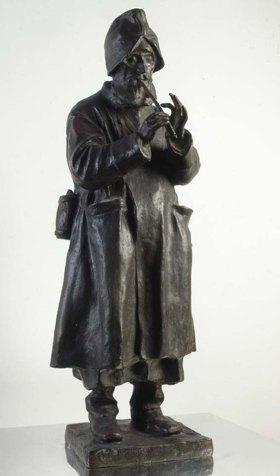 L’opera raffigura un uomo anziano a figura intera, coperto da un pastrano mentre suona un piffero che tiene fra le mani. Di quest’opera si conoscono più versioni, una delle quali facente parti della Raccolta Lercaro, costituitasi per volere e impegno del cardinale Giacomo Lercaro, inizialmente grazie alle donazioni al cardinale stesso in occasione del suo ottantesimo compleanno. La raccolta si è poi progressivamente ampliata grazie a donazioni, e ora conta 1800 opere, e fu inaugurata nel 1989. Inizialmente ospitata presso la Galleria d’Arte Moderna di Bologna, è dal 2003 presso l’Istituto Veritatis Splendor. Interessato alla scultura di genere che nella vasta produzione di questo artista occupa un posto importante, si ricorda che un nucleo di sue opere dello stesso tipo sono conservate presso la Galleria d’Arte Moderna di Milano. Tra queste anche il gesso dal titolo Esaurimento, che denota una certa vicinanza con il lavoro di Trieste. Si tratta di una figura di vecchio seduta con cappotto sulle spalle, gambe aperte e braccia congiunte all’altezza delle ginocchia. Le mani sovrapposte sono appena sopra il braciere; lo sguardo perso nel vuoto. L’adesione alle problematiche del realismo sociale da parte dello scultore, però, non viene mai espresso attraverso un realismo esagerato. L’opera del Revoltella è entrata a far parte della collezione museale tramite permuta con la “Galleria Trieste” del quadro Il legaccio di Lino Selvatico.