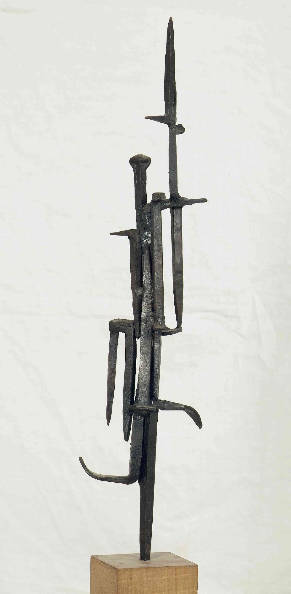 L’opera fu acquistata dal museo alla Biennale di Venezia del 1958, grazie all’intercessione dello scultore Marcello Mascherini. Nella stessa occasione quest’ultimo, trattando direttamente con gli artisti, riuscì ad ottenere a prezzi ribassati anche altre importanti sculture, come la Cariatide di Alberto Viani, Figura sola di Mario Negri e L’uomo col gallo di Carmelo Cappello, scultori presenti alla Biennale con una sala personale. Franchina vi aveva esposto quattordici lavori realizzati negli ultimi tre anni, durante i quali – attratto dalle potenzialità espressive del ferro – aveva dato vita a surreali assemblages di chiodi, uncini e tubi. Con queste parole l’autore aveva spiegato la sua predilezione per il metallo: «Il ferro si piega dolcissimo; quand’è incandescente ha un fascino immenso, si contorce, guizza, si offre, danza». Alla rassegna veneziana erano presenti ben tre opere con il titolo di Ikebana, una del 1957 e due del ’58, tuttavia, grazie ad una lettera inviata dal Direttore dell’Ufficio Vendite della Biennale Ettore Gian Ferrari (CMR, Arch. Amm., 13.1958.4680), è possibile identificare l’opera in esame con Ikebana 3, pubblicato in catalogo con il numero 14. Altre versioni dello stesso soggetto appartengono alla Collezione Litrico di Roma e alla collezione degli eredi dell’artista. Il titolo richiama le studiate composizioni floreali giapponesi, nelle quali gli elementi verticali alludono alla tensione spirituale dalla terra al cielo. Anche per altri lavori dello stesso periodo Franchina ha trovato ispirazione nel mondo vegetale e animale, interpretando in chiave simbolica gli elementi della natura e trasformandoli, con uno stile asciutto ed espressivo, in emblemi della condizione esistenziale dell’umanità uscita dal secondo conflitto mondiale. Come ha scritto Emilio Villa presentando l’artista nel catalogo della Biennale del ’58, «sono immagini, colpite dalla sete, di rami scheletrici difformi, di articolazioni tantaliche, di invenzioni irritate, di materie in cui si amalgama il liscio della lastra, il febbrile dell’epidermide, il rude della scorza; e non può passare senza elogio sincero lo sforzo dello scultore che recupera dai metalli la grazia estrema del crudele, l’oscuro senso dell’unità dell’uomo moderno nella crisi dell’espiazione».