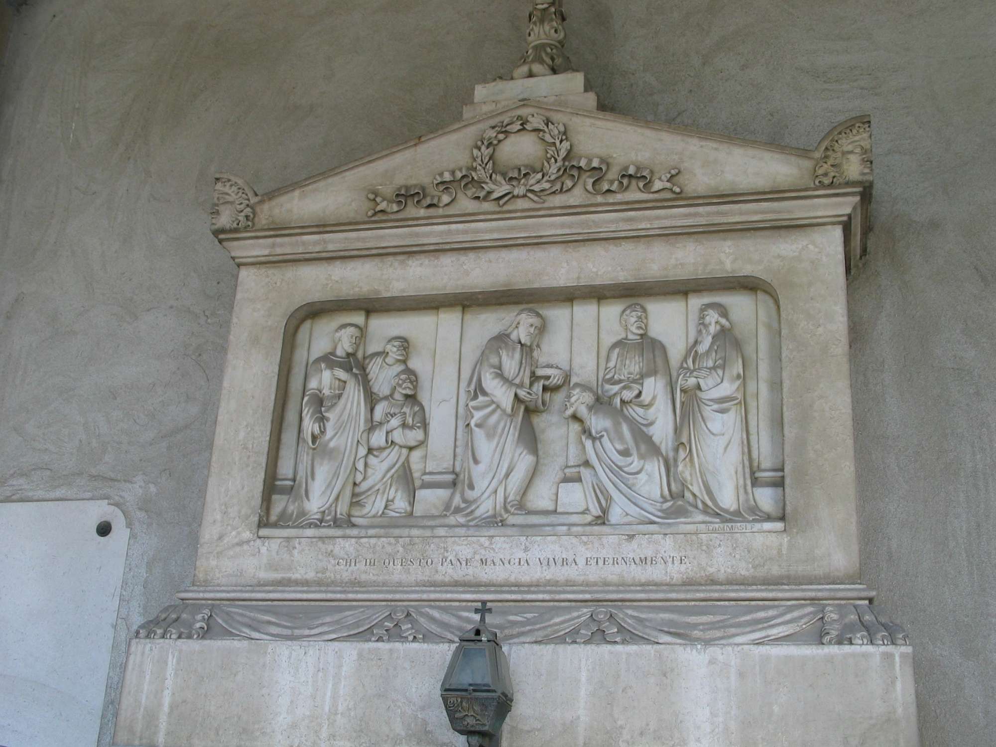 Al di sopra di un basamento liscio, terminante con un bordo sagomato aggettante decorato da palmette, poggia un'edicola coronata da un frontone triangolare su cui, svetta una croce e in cui è rilevata una corona d'alloro cinta da un nastro. Al centro è ospitato il rilievo raffigurante l'episodio della Comunione degli Apostoli. La base dell'edicola è impreziosita agli angoli da zampe leonine dalle quali si diparte un festone di stoffa. Nello spazio antistante è posta una lapide mistilinea decorata da due testine di cherubino e da fiori.