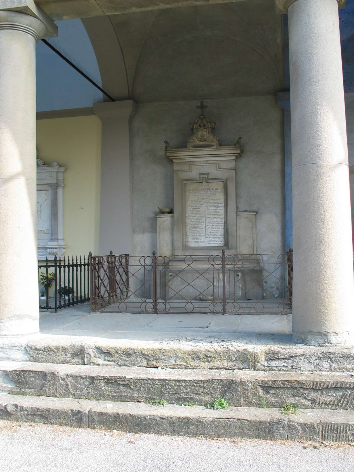 Stele frontonata coronata da un rilievo con lo stemma gentilizio sormontato a sua volta da una croce. Sopra le due ali laterali sono appoggiate due lampade (quella di destra è caduta).