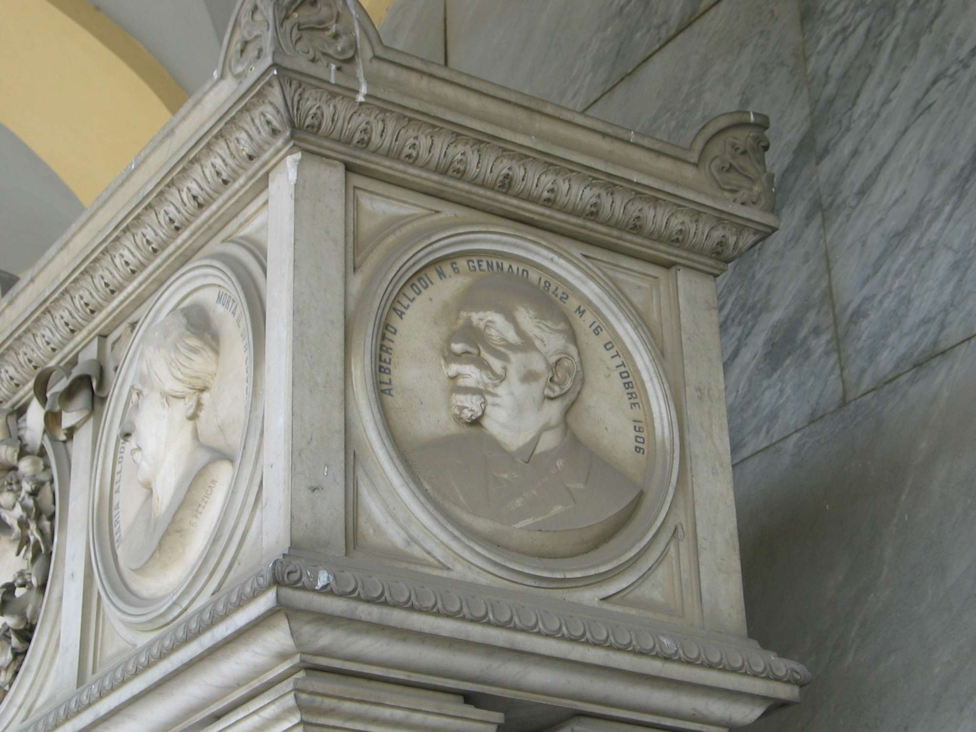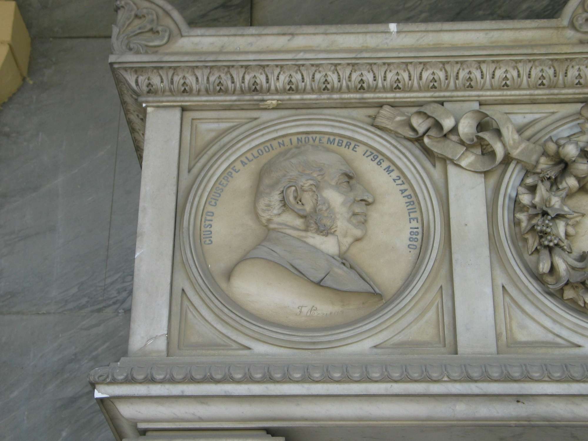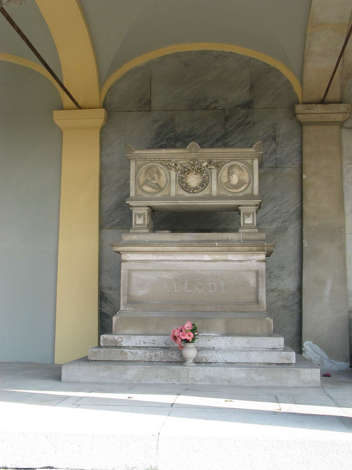Un sarcofago poggiante su un basamento marmoreo è ornato da quattro tondi con, a bassorilievo, i ritratti dei membri della famiglia Allodi; sul fronte Giusto Giuseppe e Maria con al centro una ghirlanda di fiori, sui lati minori due ritratti maschili. Sulla destra Rodolfo Allodi e sulla sinistra Alberto Allodi.