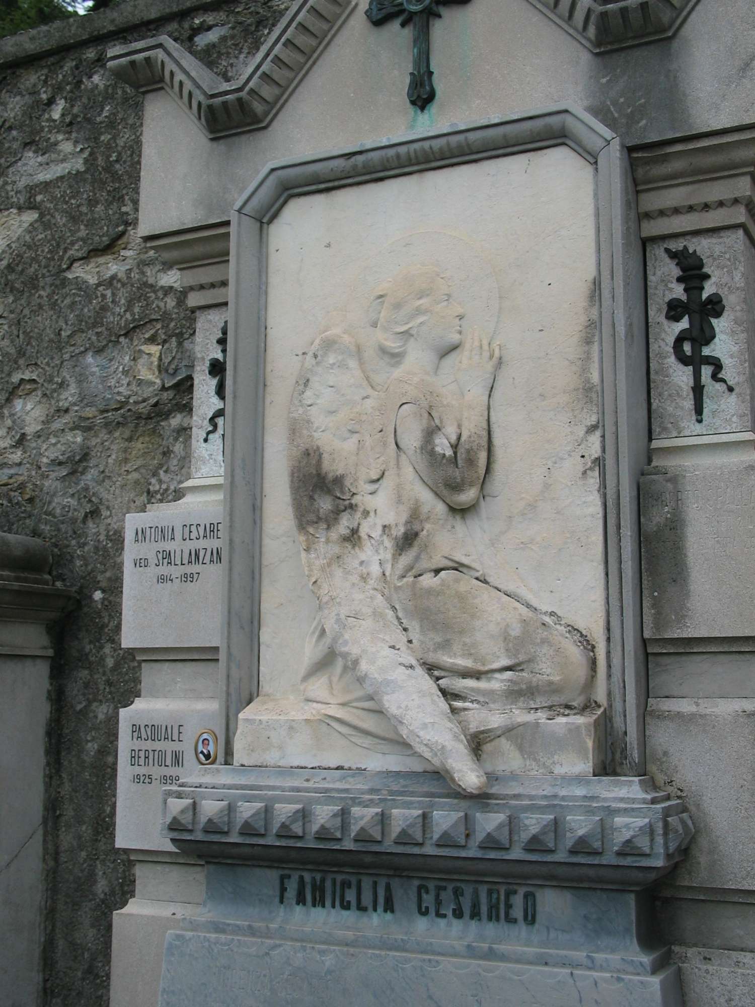 Sulla lastra tombale, tra due fiaccole e sormontata da una croce in bronzo, appare, a bassorilievo e di profilo, la figura di un angelo inginocchiato con le mani giunte in segno di preghiera.