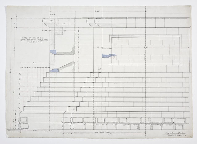 Si tratta di uno dei disegni progettuali del Faro della Vittoria, eseguiti da Arduino Berlam, che li donò ai Civici Musei di Storia ed Arte nel 1935, cfr. le schede da CMSAOAR06_3598 a CMSAOAR06_3634. In particolare, la tavola descrive il rivestimento del torrione rotondo, già esistente, in una struttura a scaglioni, provvista di targa per iscrizione sul prospetto principale. A partire dal 1919, Arduino Berlam lavorò alla progettazione del Faro della Vittoria, architettura celebrativa e simbolica, che rispondeva al desiderio di esaltazione della patria e dell’italianità di Trieste redenta, sorto dopo la Grande Guerra, e alla necessità di onorare i suoi caduti. Già durante il conflitto, Berlam aveva ipotizzato di erigere un faro in onore di Nazario Sauro, eroe del mare, sulla punta istriana di Salvore, a poca distanza da Capodistria (cfr. CMSAOAR06_3631). Tuttavia questa prima idea fu modificata a guerra conclusa, quando la Lega navale propose di costruire il faro a Trieste, per sostituire l’obsoleta lanterna di Pietro Nobile. Dal giugno 1919, quando il progetto di massima venne approvato dal Consiglio Superiore dei Lavori Pubblici a Roma, al 1927, quando il faro fu inaugurato, il suo iter costruttivo fu tormentato da problemi e ritardi causati da divergenze di ordine tecnico-artistico e dall’antagonismo contro Arduino Berlam. Edificato sulle fondamenta del forte austriaco Kressich, costruito sul colle di Gretta nel 1854, su progetto dell'architetto Karl Möring, il faro presenta una gradinata monumentale alla cui sommità si trova un solettone. Su di esso è posta la lapide con l'epigrafe dedicatoria «A. D. MCMXXVII / SPLENDI E RICORDA / I CADUTI SUL MARE / MCMXV – MCMXVIII». Il manufatto prosegue con uno zoccolo a campana da cui pende l'àncora del caccia-torpediniere Audace, che il 3 novembre 1918 attraccò sul molo triestino ad esso intitolato. Sull'avancorpo del ballatoio, da cui si innalza il fusto della colonna, poggia la statua del Marinaio ignoto, eseguita da Giovanni Mayer. La colonna, in cemento armato, è rivestita da blocchi di pietra di Orsera e termina con un capitello che sorregge il terrazzo su cui poggia la lanterna. Quest'ultima è circondata da un ulteriore ballatoio in ferro ed è coronata da una cupola di rame a squame, su cui svetta una Vittoria alata, opera anch'essa di Mayer, forgiata da Giacomo Sreboth.