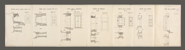 Il foglio è suddiviso in sette sezioni: feritoie della campana quota 11,665; feritorie della campana quota 14.52; porta della terrazza quota 17.66; feritoie del tamburo n.° 3; feritoie della colonna n.° 12; feritoie della murette n.° 3; porta della murette. Ciascuna sezione presenta il disegno della sezione, il prospetto interno e la pianta.