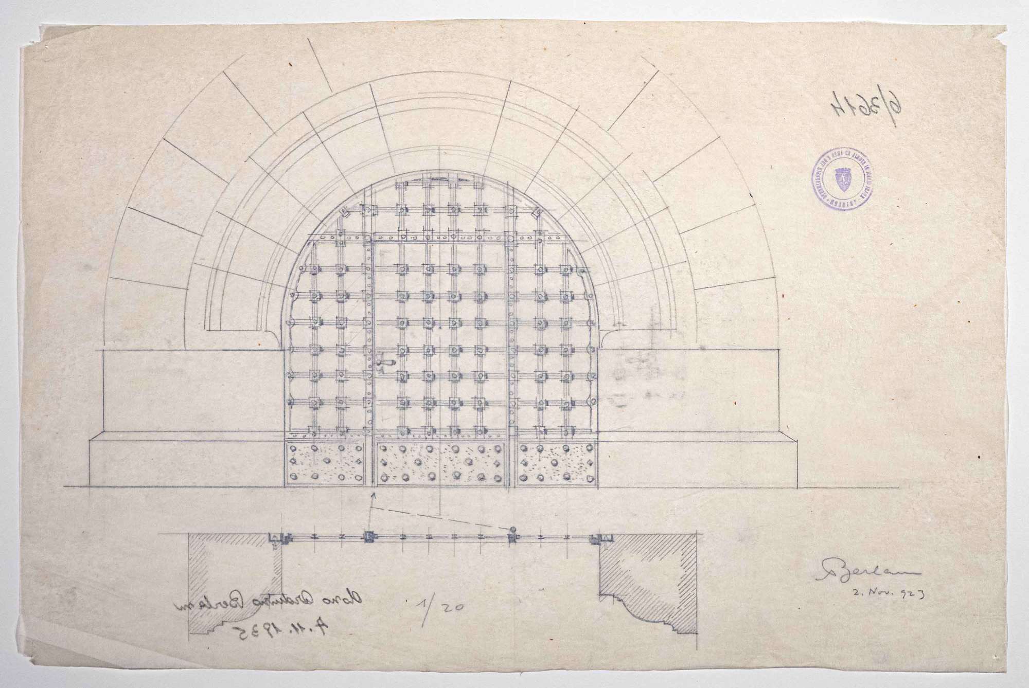 Si tratta di uno dei disegni progettuali del Faro della Vittoria, eseguiti da Arduino Berlam, che li donò ai Civici Musei di Storia ed Arte nel 1935, cfr. le schede da CMSAOAR06_3598 a CMSAOAR06_3634. In particolare, esso descrive il portone d'accesso al Faro, su cui Berlam si esercitò tra la fine dell'ottobre e l'inizio del novembre 1923. Il confronto con il disegno CMSAOAR06_3609, mostra una modifica nel motivo decorativo della maglia metallica: dagli anelli giustapposti del primo disegno, alla grata del secondo; soluzione, questa, che poi venne adottata. Quanto alle vicende del Faro della Vittoria, si rinvia alle notizie storico-critiche della scheda CMSAOAR06_3598.