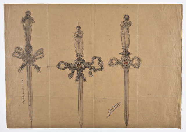 Il foglio contiene tre studi per uno spadino con elsa composta da gomene intrecciate, racchiudenti un comparto circolare con stemma della città di Trieste, e impugnatura a guisa di marinaio con le braccia conserte.