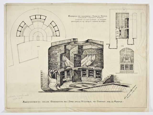 Si tratta di uno dei disegni progettuali del Faro della Vittoria, eseguiti da Arduino Berlam, che li donò ai Civici Musei di Storia ed Arte nel 1935, cfr. le schede da CMSAOAR06_3598 a CMSAOAR06_3634. In particolare, la tavola descrive l'adattamento delle casematte del Faro a ossario della Marina. A partire dal 1919, Arduino Berlam lavorò alla progettazione del Faro della Vittoria, architettura celebrativa e simbolica, che rispondeva al desiderio di esaltazione della patria e dell’italianità di Trieste redenta, sorto dopo la Grande Guerra, e alla necessità di onorare i suoi caduti. Già durante il conflitto, Berlam aveva ipotizzato di erigere un faro in onore di Nazario Sauro, eroe del mare, sulla punta istriana di Salvore, a poca distanza da Capodistria (cfr. CMSAOAR06_3631). Tuttavia questa prima idea fu modificata a guerra conclusa, quando la Lega navale propose di costruire il faro a Trieste, per sostituire l’obsoleta lanterna di Pietro Nobile. Dal giugno 1919, quando il progetto di massima venne approvato dal Consiglio Superiore dei Lavori Pubblici a Roma, al 1927, quando il faro fu inaugurato, il suo iter costruttivo fu tormentato da problemi e ritardi causati da divergenze di ordine tecnico-artistico e dall’antagonismo contro Arduino Berlam. Edificato sulle fondamenta del forte austriaco Kressich, costruito sul colle di Gretta nel 1854, su progetto dell'architetto Karl Möring, il faro presenta una gradinata monumentale alla cui sommità si trova un solettone. Su di esso è posta la lapide con l'epigrafe dedicatoria «A. D. MCMXXVII / SPLENDI E RICORDA / I CADUTI SUL MARE / MCMXV – MCMXVIII». Il manufatto prosegue con uno zoccolo a campana da cui pende l'àncora del caccia-torpediniere Audace, che il 3 novembre 1918 attraccò sul molo triestino ad esso intitolato. Sull'avancorpo del ballatoio, da cui si innalza il fusto della colonna, poggia la statua del Marinaio ignoto, eseguita da Giovanni Mayer. La colonna, in cemento armato, è rivestita da blocchi di pietra di Orsera e termina con un capitello che sorregge il terrazzo su cui poggia la lanterna. Quest'ultima è circondata da un ulteriore ballatoio in ferro ed è coronata da una cupola di rame a squame, su cui svetta una Vittoria alata, opera anch'essa di Mayer, forgiata da Giacomo Sreboth.