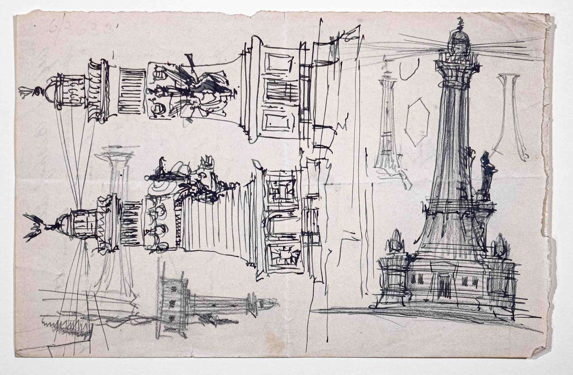 Si tratta di uno dei disegni progettuali del Faro della Vittoria, eseguiti da Arduino Berlam, che li donò ai Civici Musei di Storia ed Arte nel 1935, cfr. le schede da CMSAOAR06_3598 a CMSAOAR06_3634. In particolare, il foglio contiene numerosi schizzi in cui l'architetto si esercita sulla forma del faro. Già durante la Grande Guerra, Berlam aveva ipotizzato di erigere un faro in onore di Nazario Sauro, eroe del mare, sulla punta istriana di Salvore, a poca distanza da Capodistria (cfr. CMSAOAR06_3631). Non si esclude che questo foglio risalga a quella fase progettuale, poi modificata a guerra conclusa, quando la Lega navale propose di costruire il faro a Trieste per sostituire l’obsoleta lanterna di Pietro Nobile. Quanto alle vicende storico-critiche del Faro della Vittoria, si rinvia alle schede CMSAOAR06_3598 e CMSAOAR06_3631.