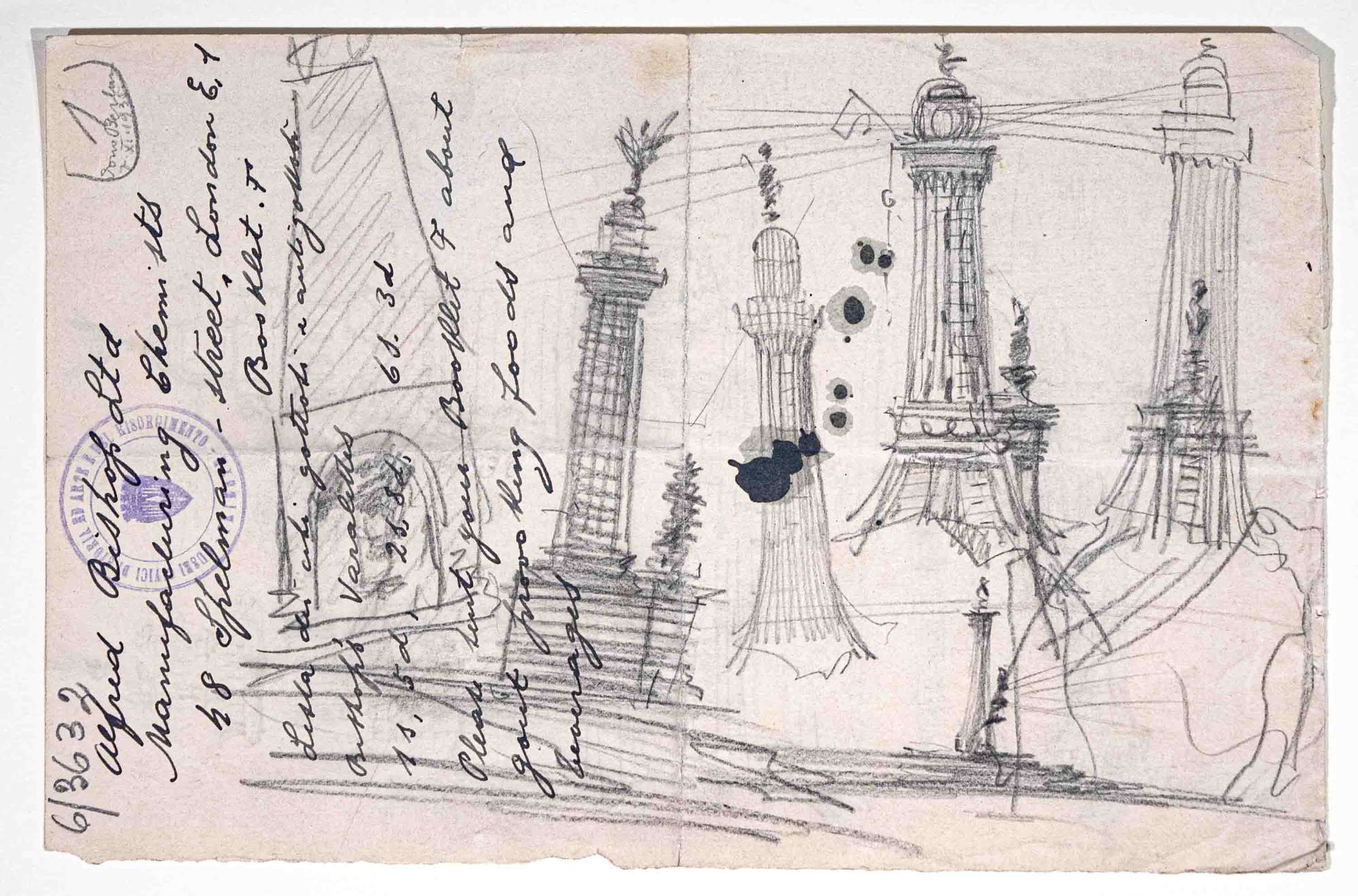 Il foglio contiene, al recto e al verso, numerosi schizzi a matita e a penna per un faro. Sul verso del foglio, appunti a penna (cfr. iscrizioni).