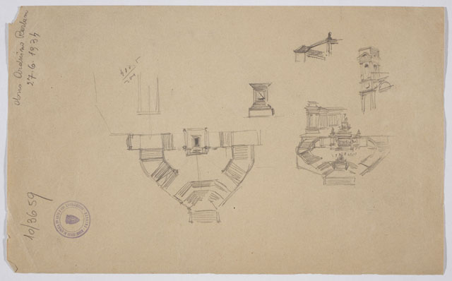 Sul recto, schizzo a matita raffigurante veduta prospettica del monumento in onore di Vittorio Emanuele II. Sul verso, altro studio del monumento, schizzo della planimetria delle prime due piattaforme e altri dettagli architettonici.
