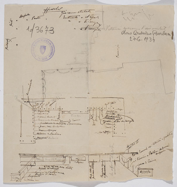 Il disegno fa parte di una serie di studi per il Monumento nazionale a Vittorio Emanuele II, cfr. schede CMSAOAR10_3646-CMSAOAR10_3688. Ruggero Berlam partecipò al secondo concorso per il monumento a Vittorio Emanuele II a Roma, indetto dal momento che la prima selezione, svoltasi nel 1880, non ebbe un vincitore. Nel primo bando l’unico vincolo posto ai progettisti era stato quello del costo; il secondo, pubblicato il 18 dicembre 1882, prevedeva di collocare il monumento sul colle Capitolino e ne fissava alcune caratteristiche: un fondale architettonico e una statua di Vittorio Emanuele II, dapprima seduto su un trono, poi a cavallo. Secondo Sticotti, Berlam inviò il progetto in incognito da Milano, per non essere riconosciuto come austriaco; ma dopo esser stato esposto a Roma, esso fu fatto sparire, su volontà del primo ministro Agostino Depretis, per non turbare i rapporti che si erano creati con l’Austria. Il concorso, cui parteciparono 98 progettisti, fu vinto da Giuseppe Sacconi, con un progetto che presenta affinità con quello di Ruggero Berlam; secondo classificato Manfredo Manfredi, terzo Bruno Schmitz. In seguito, vi fu un terzo bando ristretto ai primi tre classificati, vinto da Sacconi. Il progetto di Berlam, incentrato su purezza e classicità di linee (Marsoni 1986, p. 112), presenta una parte basamentale forte e compatta, alta la metà del monumento, che non avrebbe consentito di vedere il colonnato dalla Piazza Venezia, ma solo da via del Corso: un errore progettuale fatale, che, secondo Pozzetto, ne sancì l’eliminazione (1999, pp. 90-91). Il disegno in esame presenta uno schizzo del sotto-basamento del monumento equestre, sul recto; mentre il verso è dedicato all'organizzazione dei gruppi scultorei di uomini illustri posti all'ombra del monumentale colonnato (cfr. il prospetto definitivo in Pozzetto 1999, pp. 90-91, figg. 152-153).