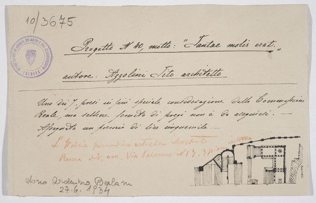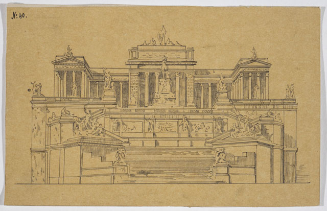 Il disegno è annesso alla serie di studi per il Monumento nazionale a Vittorio Emanuele II, cfr. schede CMSAOAR10_3646-CMSAOAR10_3688, eseguiti da Ruggero Berlam. Egli partecipò al secondo concorso per il monumento a Vittorio Emanuele II a Roma, indetto dal momento che la prima selezione, svoltasi nel 1880, non ebbe un vincitore. Nel primo bando l’unico vincolo posto ai progettisti era stato quello del costo; il secondo, pubblicato il 18 dicembre 1882, prevedeva di collocare il monumento sul colle Capitolino e ne fissava alcune caratteristiche: un fondale architettonico e una statua di Vittorio Emanuele II, dapprima seduto su un trono, poi a cavallo. Secondo Sticotti, Berlam inviò il progetto in incognito da Milano, per non essere riconosciuto come austriaco; ma dopo esser stato esposto a Roma, esso fu fatto sparire, su volontà del primo ministro Agostino Depretis, per non turbare i rapporti che si erano creati con l’Austria. Il concorso, cui parteciparono 98 progettisti, fu vinto da Giuseppe Sacconi, con un progetto che presenta affinità con quello di Ruggero Berlam; secondo classificato Manfredo Manfredi, terzo Bruno Schmitz. In seguito, vi fu un terzo bando ristretto ai primi tre classificati, vinto da Sacconi. Quanto al disegno in esame, si tratta di una copia del progetto N. 40 presentato al secondo concorso dall'architetto bolognese Tito Azzolini (1837-1907), che ricevette uno dei secondi premi e, succcessivamente, entrò a far parte della Commissione Reale per l'esecuzione del monumento. Immagini del progetto si conservano presso il Museo Civico del Risorgimento di Bologna.
