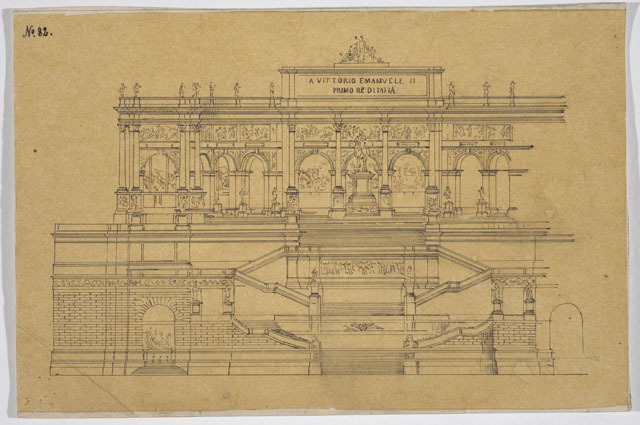 Il disegno è annesso alla serie di studi per il Monumento nazionale a Vittorio Emanuele II, cfr. schede CMSAOAR10_3646-CMSAOAR10_3688, eseguiti da Ruggero Berlam. Egli partecipò al secondo concorso per il monumento a Vittorio Emanuele II a Roma, indetto dal momento che la prima selezione, svoltasi nel 1880, non ebbe un vincitore. Nel primo bando l’unico vincolo posto ai progettisti era stato quello del costo; il secondo, pubblicato il 18 dicembre 1882, prevedeva di collocare il monumento sul colle Capitolino e ne fissava alcune caratteristiche: un fondale architettonico e una statua di Vittorio Emanuele II, dapprima seduto su un trono, poi a cavallo. Secondo Sticotti, Berlam inviò il progetto in incognito da Milano, per non essere riconosciuto come austriaco; ma dopo esser stato esposto a Roma, esso fu fatto sparire, su volontà del primo ministro Agostino Depretis, per non turbare i rapporti che si erano creati con l’Austria. Il concorso, cui parteciparono 98 progettisti, fu vinto da Giuseppe Sacconi, con un progetto che presenta affinità con quello di Ruggero Berlam; secondo classificato Manfredo Manfredi, terzo Bruno Schmitz. In seguito, vi fu un terzo bando ristretto ai primi tre classificati, vinto da Sacconi. Quanto al disegno in esame, si tratta di una copia del progetto N. 82 presentato al secondo concorso dal pittore Luigi Bazzani (Bologna, 1836 - Roma, 1927) che ricevette un premio di cinquemila lire per l'architettura e una medaglia di merito in argento per la statua equestre.
