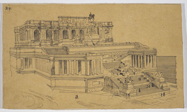 Il disegno è annesso alla serie di studi per il Monumento nazionale a Vittorio Emanuele II, cfr. schede CMSAOAR10_3646-CMSAOAR10_3688, eseguiti da Ruggero Berlam. Egli partecipò al secondo concorso per il monumento a Vittorio Emanuele II a Roma, indetto dal momento che la prima selezione, svoltasi nel 1880, non ebbe un vincitore. Nel primo bando l’unico vincolo posto ai progettisti era stato quello del costo; il secondo, pubblicato il 18 dicembre 1882, prevedeva di collocare il monumento sul colle Capitolino e ne fissava alcune caratteristiche: un fondale architettonico e una statua di Vittorio Emanuele II, dapprima seduto su un trono, poi a cavallo. Secondo Sticotti, Berlam inviò il progetto in incognito da Milano, per non essere riconosciuto come austriaco; ma dopo esser stato esposto a Roma, esso fu fatto sparire, su volontà del primo ministro Agostino Depretis, per non turbare i rapporti che si erano creati con l’Austria. Il concorso, cui parteciparono 98 progettisti, fu vinto da Giuseppe Sacconi, con un progetto che presenta affinità con quello di Ruggero Berlam; secondo classificato Manfredo Manfredi, terzo Bruno Schmitz. In seguito, vi fu un terzo bando ristretto ai primi tre classificati, vinto da Sacconi. Quanto al disegno in esame, si tratta di una copia del progetto N. 91 presentato da Enrico Becchetti che ricevette una medaglia di merito in argento per la parte archiettonica e la statua equestre.
