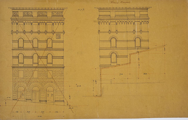 Tavola raffigurante i prospetti di due lati corti di edificio: quello a sinistra è quotato e barrato; quello a destra, presenta inoltre le misure dell'ingombro della costruzione contigua. Sul verso, rilievo topografico dell'area di via Benedetto Marcello e calcoli matematici.