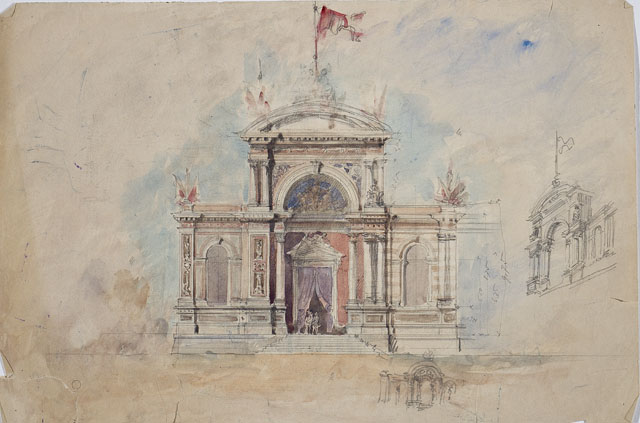 Si tratta del progetto per uno dei padiglioni, eseguiti da Giovanni Andrea Berlam in occasione dell'Esposizione Agricola-Industriale, svoltasi nel 1882 nella zona di Sant'Andrea a Trieste. Berlam eseguì i tre padiglioni principali, la tettoia in ferro dell'ingresso e si occupò del piano generale dell'area espositiva. Si tratta di esempi di edilizia espositiva effimera, in cui l'architetto giunse, secondo la critica, a una sintesi della sua attività: "forme di grande purezza, distillazione dei suoi grandi temi - il rinascimento veneto di Coducci e il classicismo manierista dell'ultimo decennio - e una nuova bellezza, quella delle lunghe facciate modulari, dalle proporzioni e scansioni elegantissime" (Lettis 1993, pp. 81-82). Il progetto in esame, destinato al padiglione 1, presenta un attico con frontone a fregio convesso e due soluzioni decorative per la facciata: a sinistra, specchiature con decori a candelabra; a destra, colonne raddoppiate segnano l'accesso al padiglione e il profilo esterno, mentre l'intonaco è a fasce bianche e rosse.