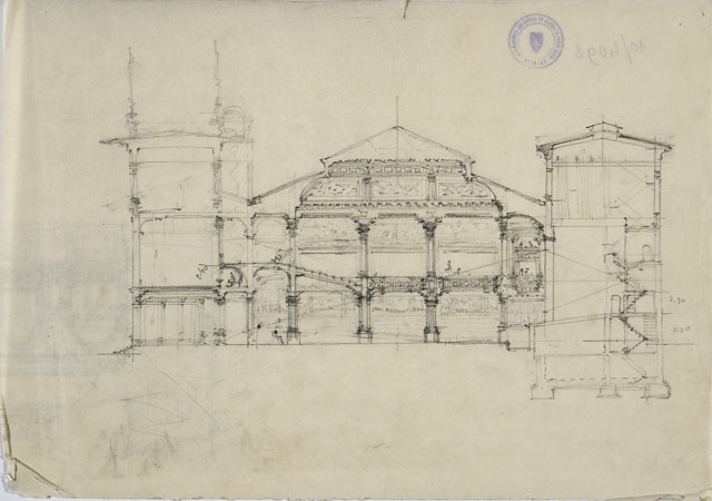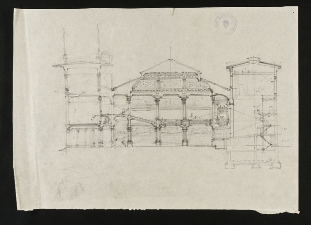 Disegno parzialmente quotato raffigurante spaccato di cine-teatro, sul recto; dettaglio dello stesso spaccato, sul verso.