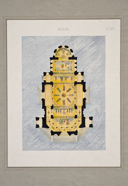 Un passe-partout riquadrato incornicia un disegno ad acquerello: entro campo dipinto di azzurro, planimetria di una chiesa a navata unica con due campanili laterali a base quadrata, che affiancano la facciata, e transetto, inscritto nel perimetro della chiesa, coperto da cupola. In corrispondenza dei diversi ambienti, sono tratteggiati verosimilmente i soggetti decorati sulle volte.
