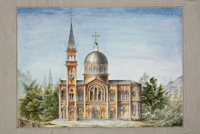 Entro passe-partout riquadrato, disegno ad acquerello, raffigurante il prospetto laterale di una chiesa entro un paesaggio.